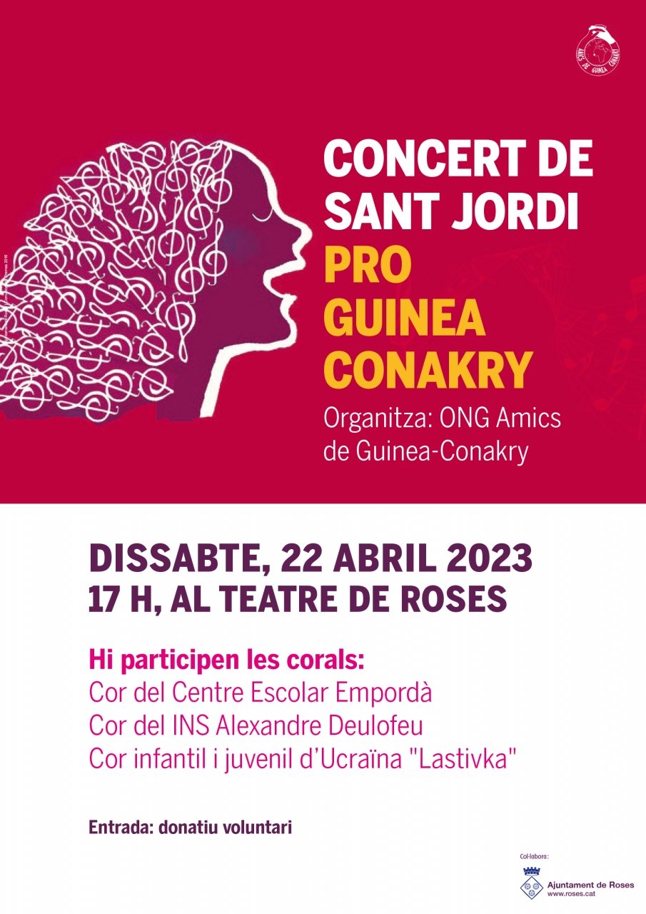 Concert de Sant Jordi Pro Amics de Guinea Conakry https://www.roses.cat/agenda/activitats/3521 https://www.roses.cat/@@site-logo/escut.png Concert de Sant Jordi Pro Amics de Guinea Conakry 22-04-2023 / 17:00 Lloc: Teatre Municipal Preu: Gratuït Dia i hora: 22/04/2023 17:00 fins a 17:00 Què: Espectacles Compartir: Accions del document Canal RSS Imprimeix-ho Envia