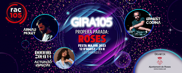 Gira105 (DJs de RAC105) A l'àntic càmping Bahía https://www.roses.cat/agenda/activitats/3607 https://www.roses.cat/@@site-logo/escut.png Gira105 (DJs de RAC105) A l'àntic càmping Bahía 12-08-2023 / 23:00 Lloc: Recinte firal antic Càmping Bahia Preu: Gratuït Dia i hora: 12/08/2023 23:00 fins a 23:00 Què: Festa major Compartir: Accions del document Canal RSS Imprimeix-ho Envia