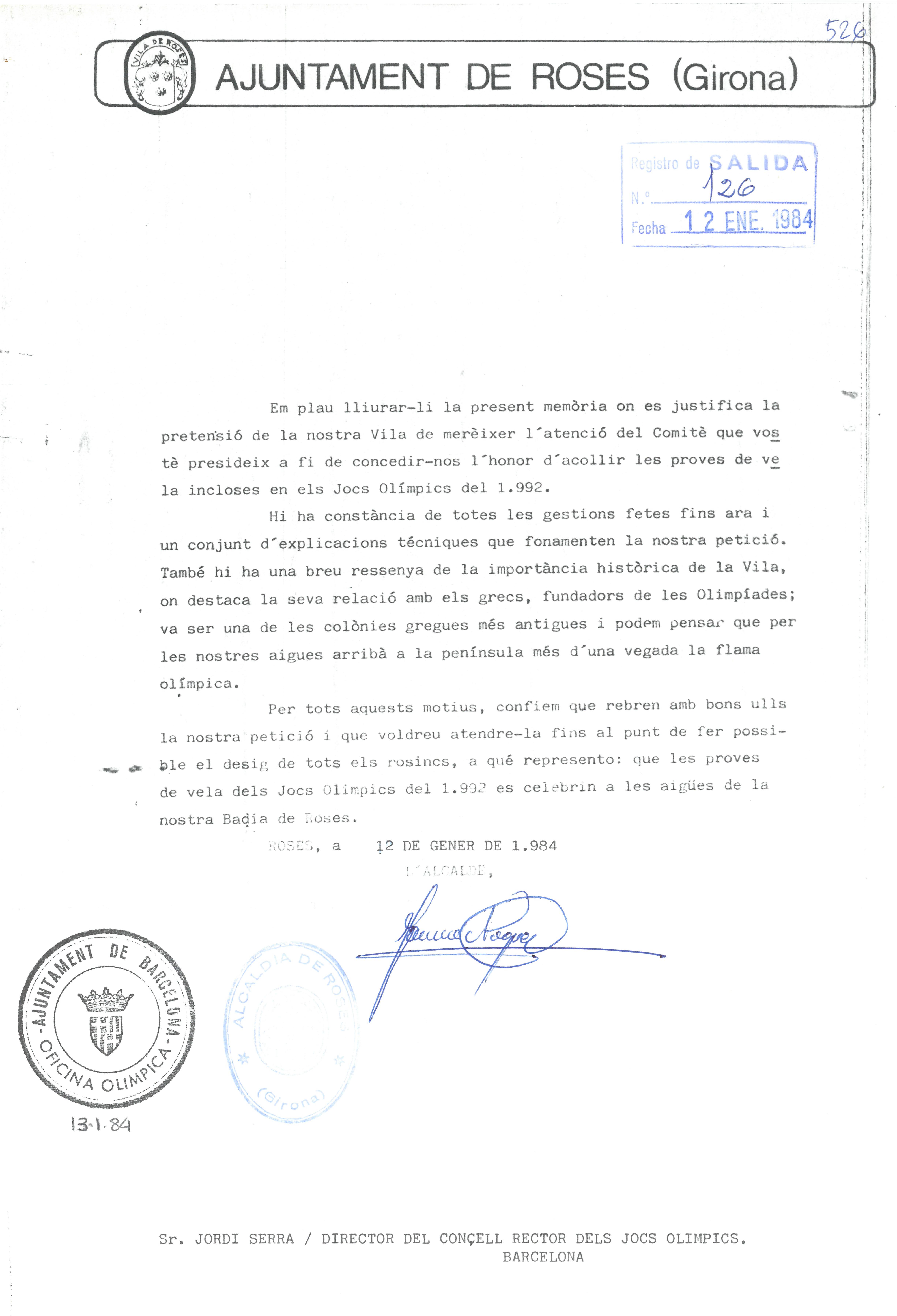 Carta a l'Oficina Olímpica de Barcelona de 1984