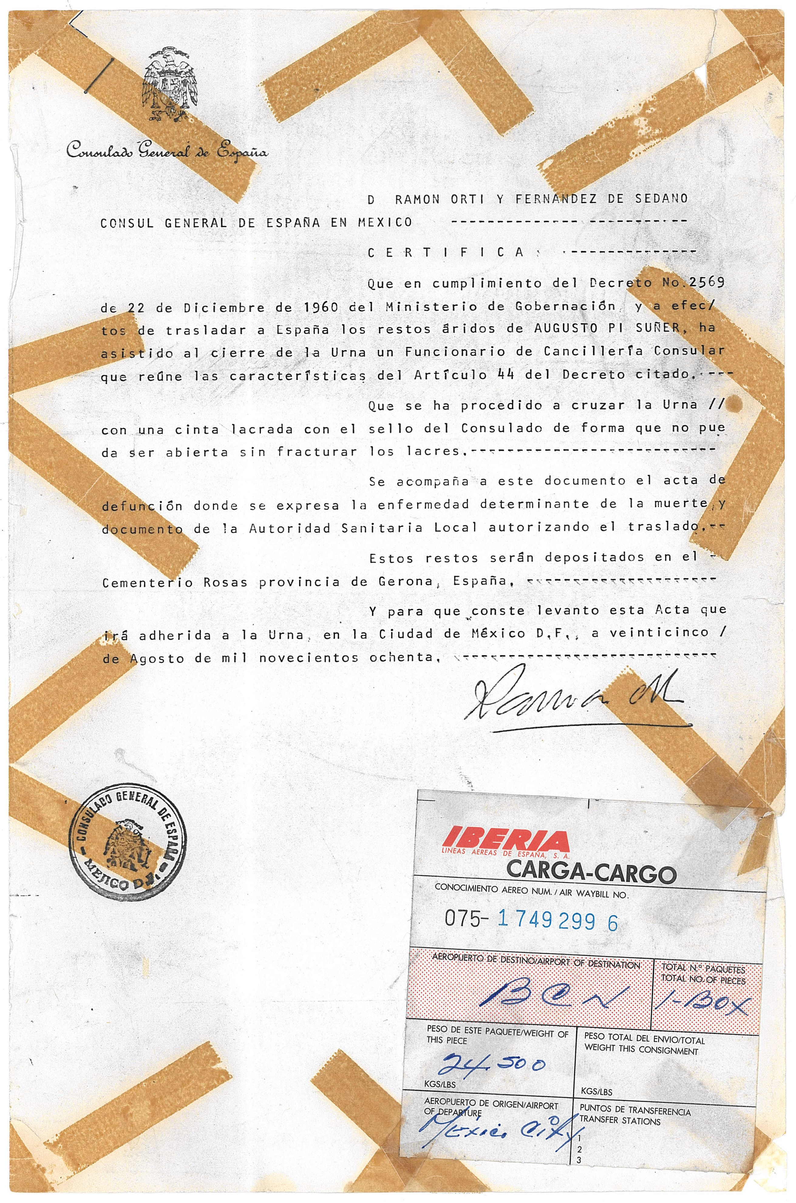Certificat d'enviament de les cendres d'August Pi i Sunyer