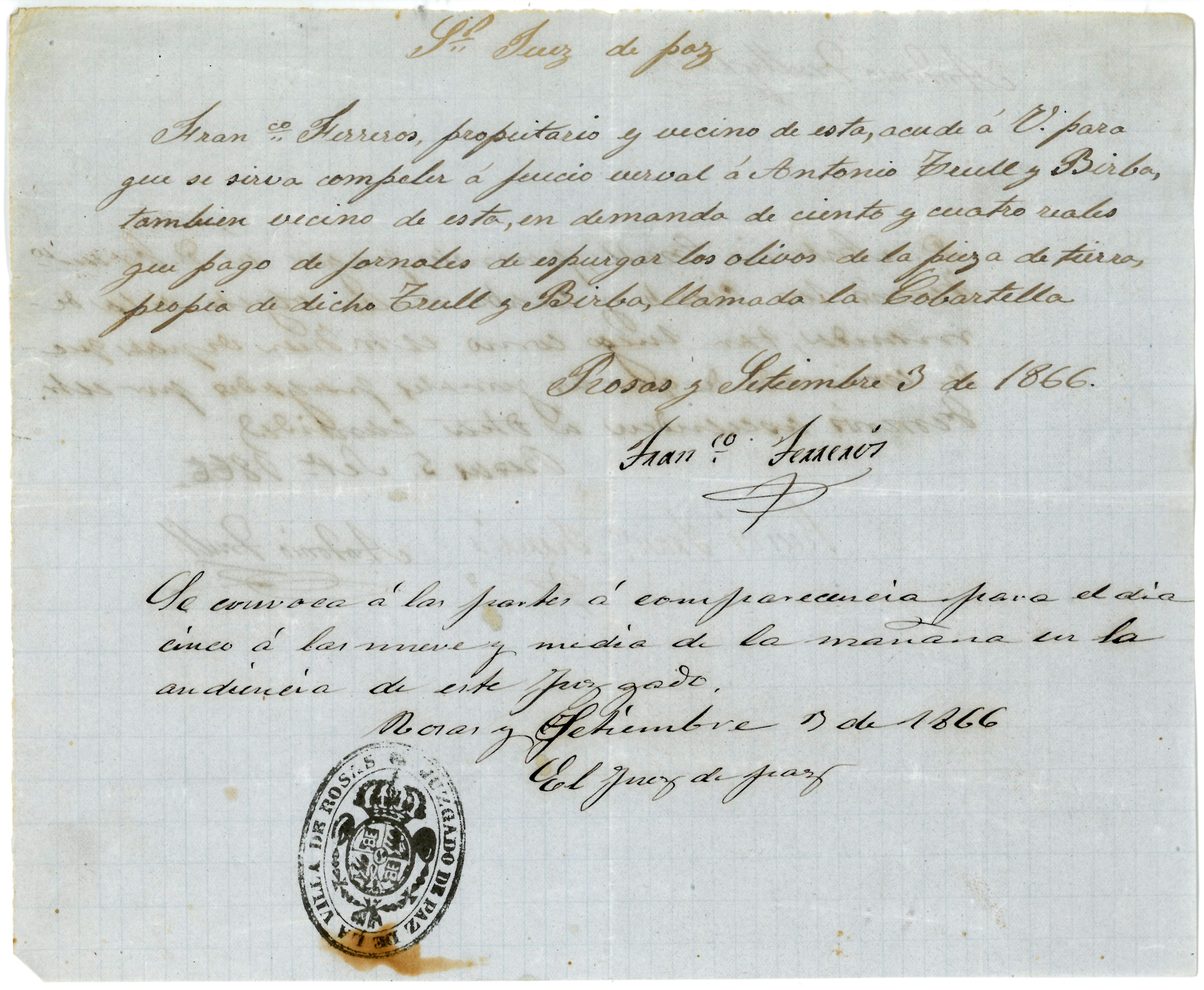 Judici verbal entre Francisco Ferrerós i Antonio Trull de 1866