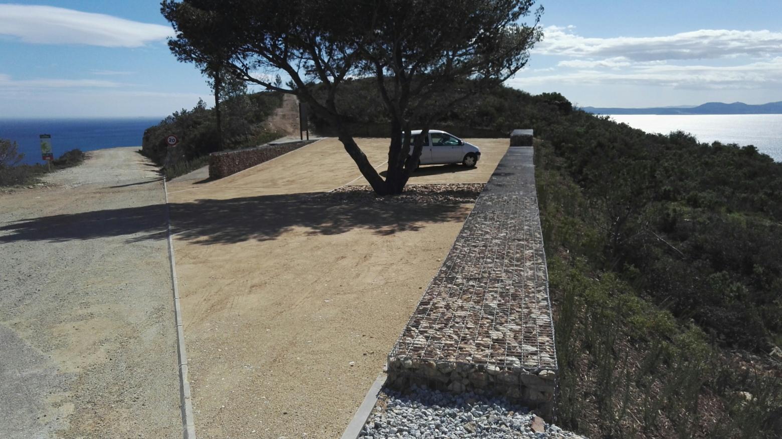 L’objecte d’aquest projecte és adequar un aparcament exterior i un mirador a Punta Falconera, L’adequació del mirador, situat al final del corriol, per on s’accedia a l’antic punt de guaita de la Punta Falconera, a la carretera de Montoi, consistirà en la instal·lació d’un banc format per blocs de mur de gabions de 50 cm d’amplada i 50 cm altura i tindrà uns 15 m de longitud. L’aparcament es conforma com un eixamplament del vial, respectant-ne l’actual disposició i les rasants existents. La plataforma d’aquest aparcament serà el resultat del terraplenat amb terres compactes l’espai entre el bordó existent i el mur de contenció de gabions.