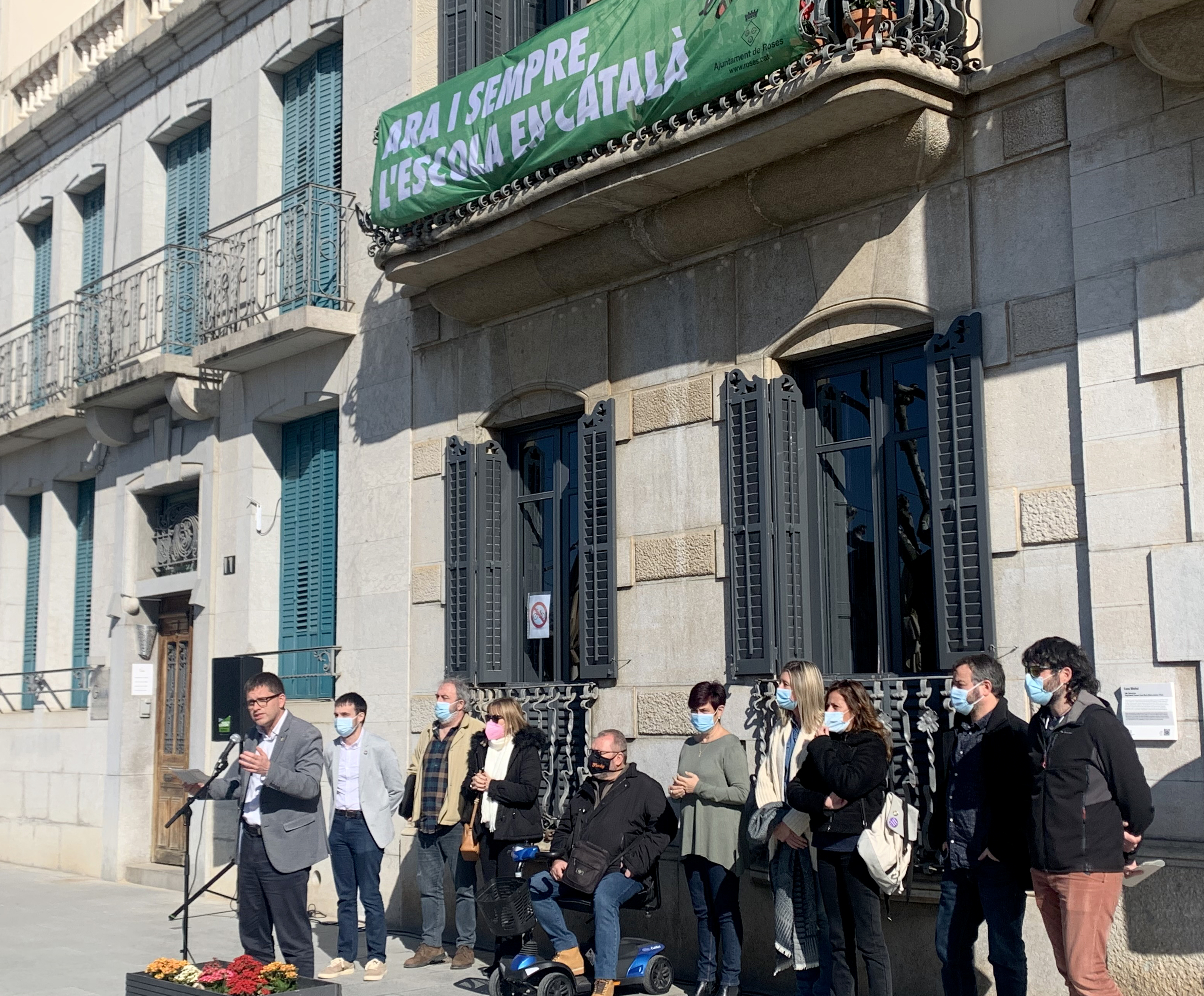 L’acte s’ha iniciat a les 12.45 h amb la lectura del manifest en suport de l’escola en català a càrrec del regidor d’Ensenyament, seguit d’un parlament de l’alcalde. Des d’avui, el balcó de la façana principal de l’Ajuntament, llueix també una pancarta amb el lema "Ara i sempre, l’escola en català".