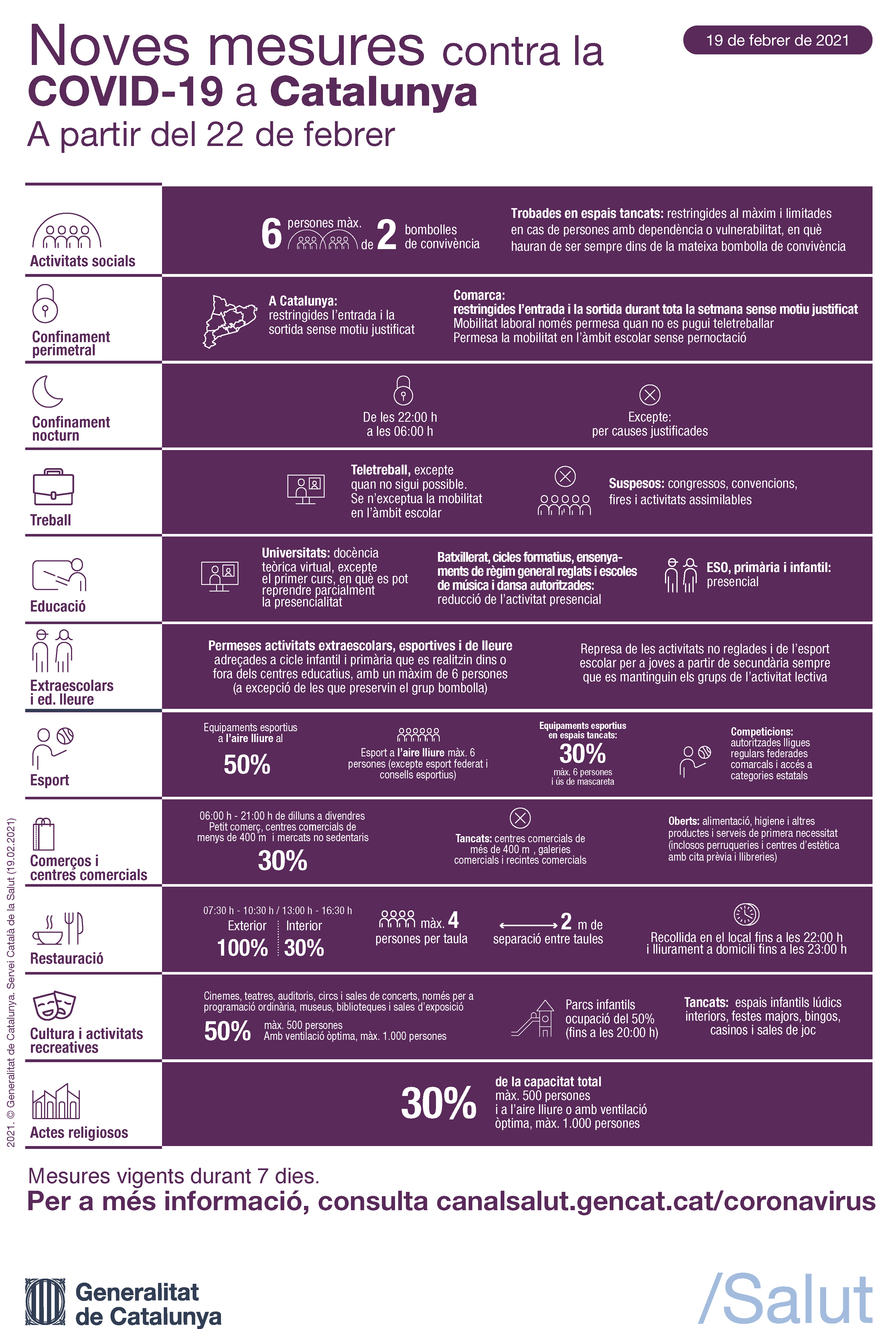 Es manté vigent per tant la limitació de l’entrada i sortida de persones de Catalunya, exceptuant aquells desplaçaments adequadament justificats, i també el confinament de perímetre comarcal. El confinament nocturn no varia i continua establert entre les 22h i les 6h.