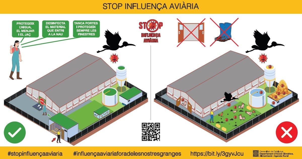 El Departament d'Acció Climàtica, Alimentació i Agenda Rural de la Generalitat de Catalunya alerta de la detecció de diversos virus a Catalunya d'influença aviària (IA) que afecten a les aus de corral i a altres tipus d'aus. Aquests virus estan avançant i són potencialment perillosos tant per les pèrdues que poden ocasionar al sector primari com per la potencialitat que tenen de saltar entre espècies. Davant aquest fet, es recomana a totes les granges, comercials i d'autoconsum, inclosos els particulars amb tinença d'aus de corral no registrades, l'aplicació de diverses mesures: