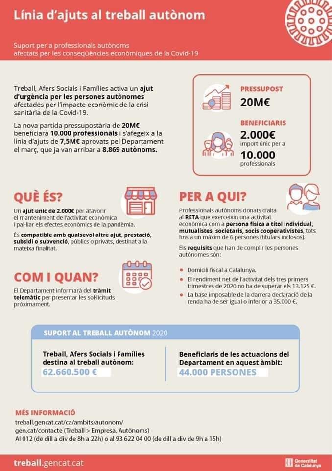 Avui, dilluns 9 de novembre, la Generalitat obre el termini per sol·licitar un ajut extraordinari i puntual per un import fix de 2000€, adreçat al manteniment de l'activitat econòmica de les persones treballadores autònomes, persona física, i les persones treballadores autònomes que formin part d'una microempresa, davant els efectes de les noves mesures adoptades per fer front a la COVID-19.
