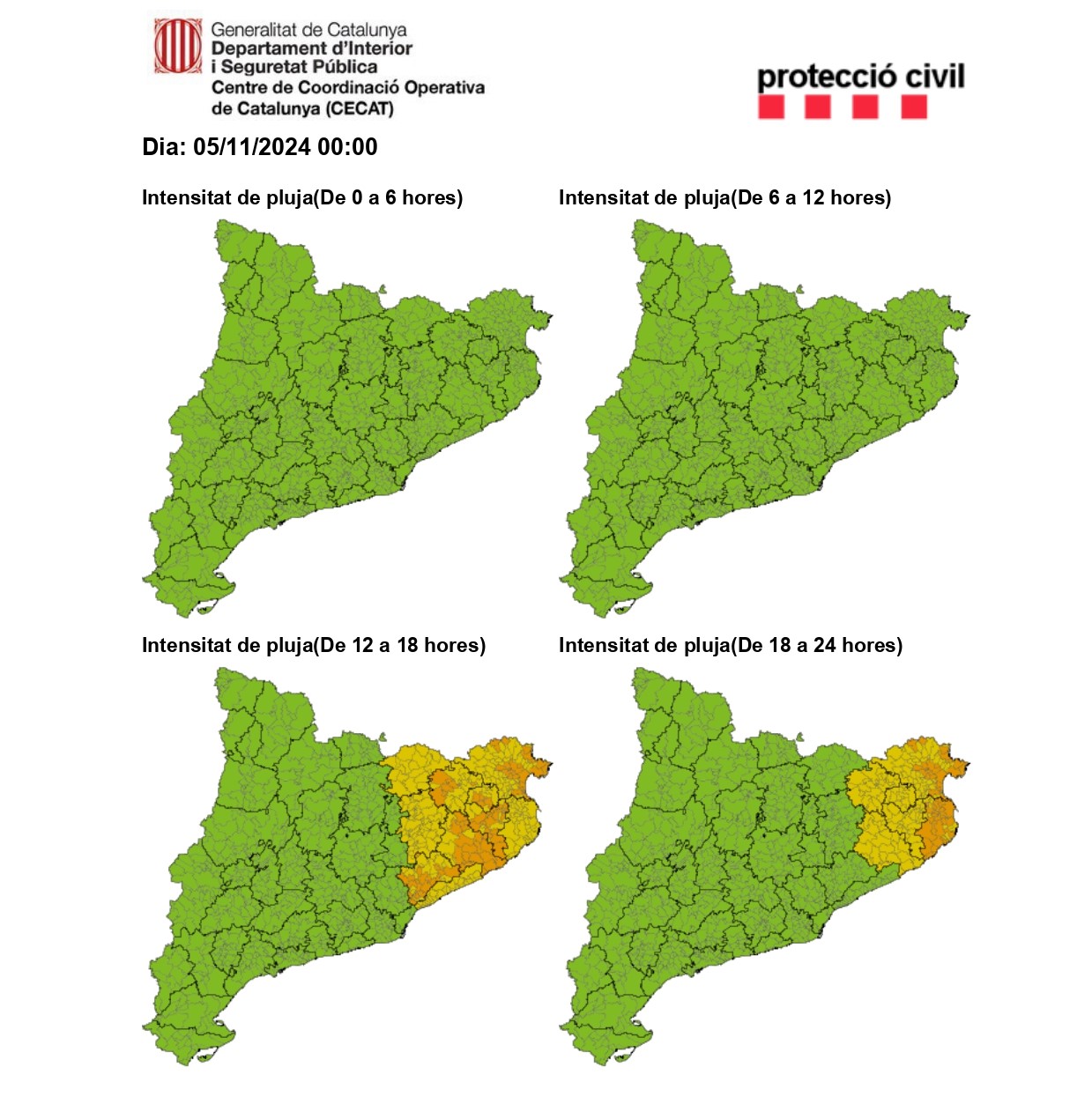Es comunica que es manté el Pla especial d'emergències per inundacions a Catalunya (INUNCAT) en situació de Prealerta. El Servei Meteorològic de Catalunya (SMC) informa que durant el dia d'avui s'esperen pluges intenses a terç nord-est de Catalunya fins al final del dia. Aquesta intensitat pot superar els 20mm en 30 minuts. Els xàfecs poden anar acompanyats localment de tempesta i es possible que de calamarsa o pedra petita, la distribució de les precipitacions serà de caràcter local.