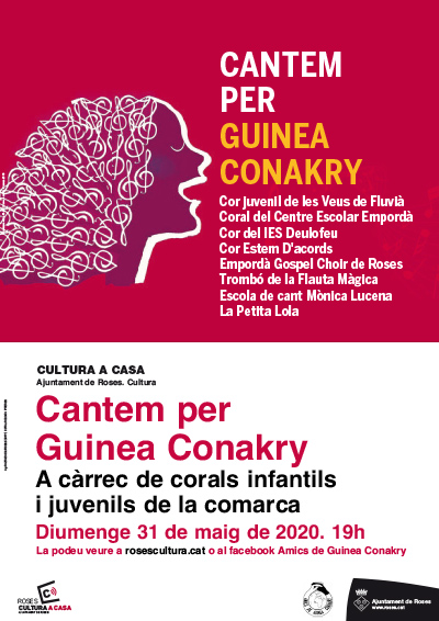El concert es podrà visionar a partir de les 19 h del proper diumenge, 31 de maig, a través de la web rosescultura.cat i del facebook d’Amics de Guinea Conakry. En aquesta ocasió, i davant les limitacions actuals per poder realitzar el concert anual de manera presencial, l’associació s’ha posat en contacte amb les corals que han participat en les edicions compreses entre els anys 2014 i 2019, les quals no han volgut fallar a aquesta cita solidària i ja han fet arribar els vídeos que conformaran el concert del proper diumenges.