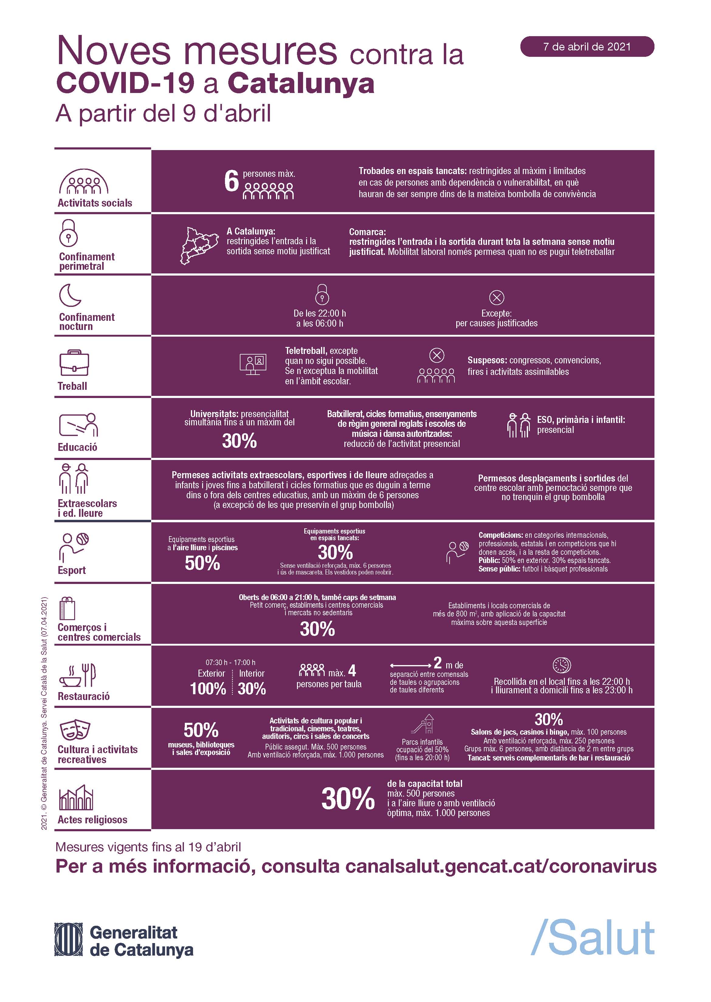 Pel que fa a la resta de mesures existents actualment, es mantenen fins al 19 d’abril. Podeu consultar les mesures que romanen vigents aquí.