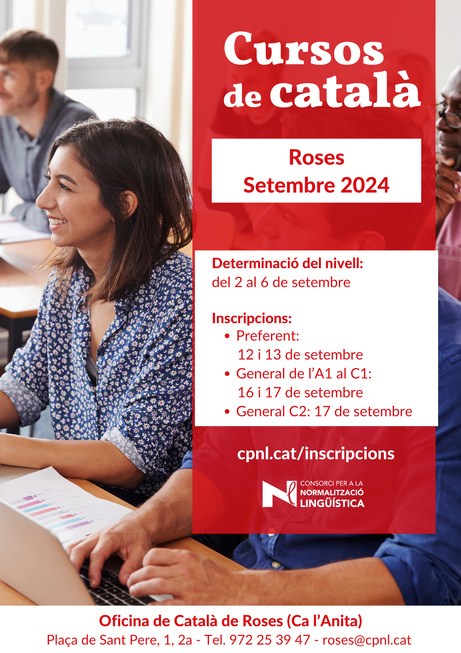 Les inscripcions als cursos generals del Consorci per a la Normalització Lingüística (CPNL) seran els dies 12, 13, 16 i 17 de setembre, segons el torn. Els interessats es podran inscriure en línia a través de la plataforma d'inscripció i també presencialment, a la xarxa de centres, serveis i oficines. A Roses, es podran fer les inscripcions presencialment a l’Oficina de Català (OC de Roses), a la pl. Sant Pere, 1, 2a (Ca l’Anita).