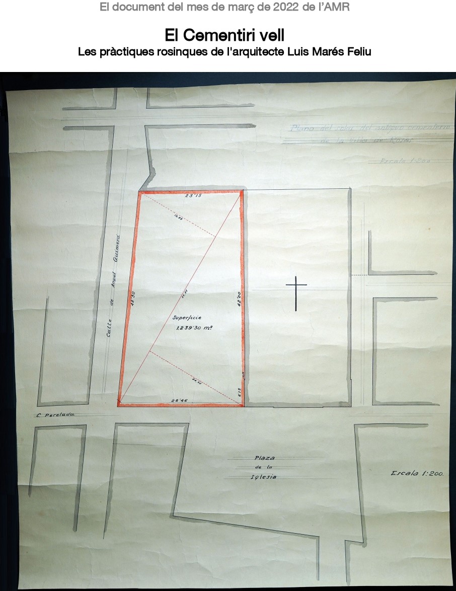 El plànol que l’Arxiu presenta aquest mes de març correspon a la finca on se situava l'antic cementiri de la parròquia de Santa Maria de Roses. Amb l'inici de la construcció de l'actual temple parroquial l'any 1792, es destinà el sector nord a necròpolis. Segons el plànol aixecat per l'arquitecte Luis Marés, el solar que ocupava l'esmentat carner tenia 1.239,30 metres quadrats. L’espai va patir una sobreocupació important al llarg del segle XIX, primer pel creixement demogràfic de la població i, en segon lloc, per la recurrència d'episodis epidèmics.