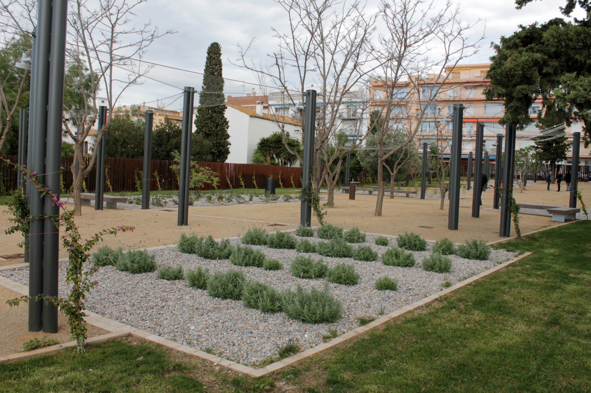 El nou jardí està format per un mosaic de zones verdes i àrees d’estada i una petita plaça amb graderia per a la realització d’activitats de petit format a l’aire lliure. Un camí creua tota la finca diferenciant els espais i potenciant les visuals cap al mar. Per sobre del camí s’ha instal·lat una pèrgola lleugera que servirà de suport perquè rosers, buguenvíl·lies, etc, s’enfilin, donant ombra a tot el recorregut amb un aspecte natural.