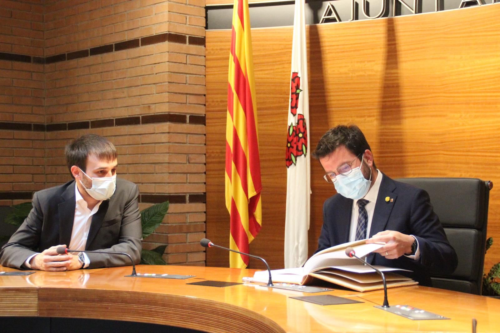 El cap de l’Executiu ha iniciat la seva visita institucional a l’Ajuntament de Roses, on ha saludat els regidors i les regidores de la corporació, traslladant-se a continuació a la sala de plens del consistori per signar el Llibre d’Honor de la vila.