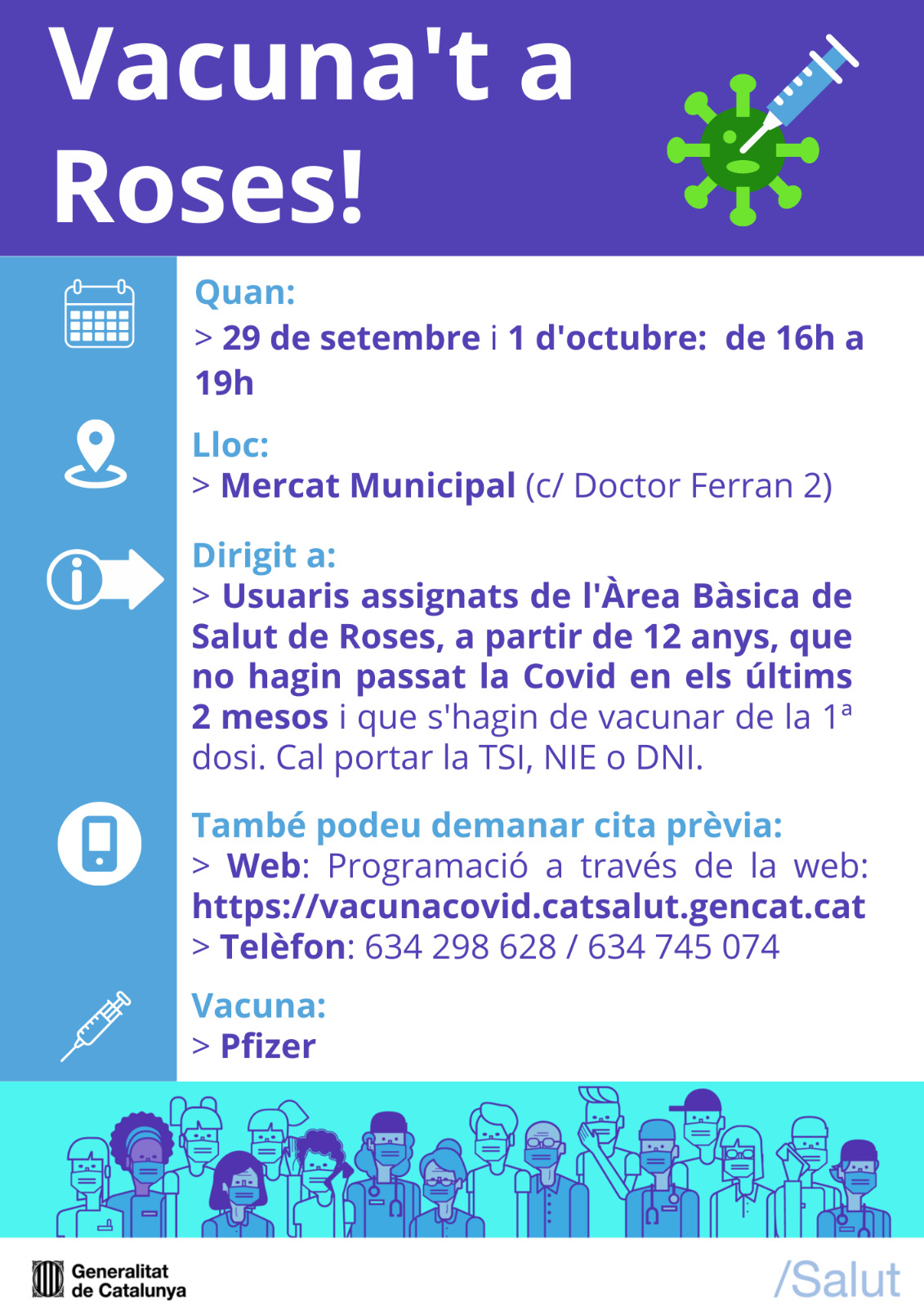 El centre de vacunació Covid-19 de Roses, ubicat al Mercat Cobert, acollirà els propers dies 29 de setembre i 1 d'octubre dues jornades de vacunació per a aquelles persones usuàries de l'Àrea Bàsica de Salut de Roses a partir de 12 anys, que no hagin passat la Covid en els darrers 2 mesos i que s'hagin d'administrar la primera dosi de la vacuna.