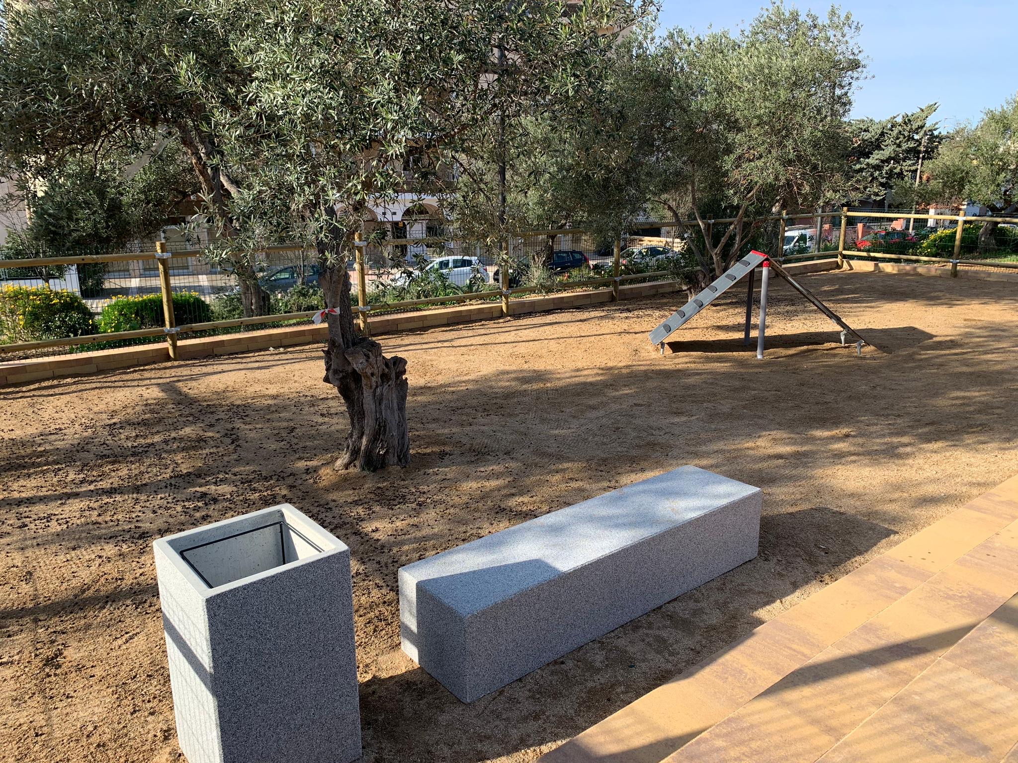 El paviment de la zona d’esbarjo s’ha fet amb sauló i s’han instal·lat l’enllumenat, xarxa d’aigua potable i una xarxa de reg sanitària que permet netejar la superfície del parc a través d’una desena d’aspersors.