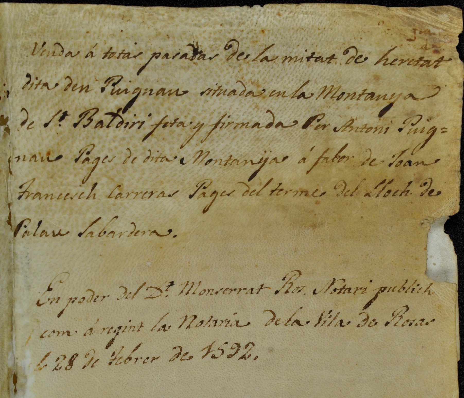 La còpia de l’escriptura va ser realitzada pel notari Antoni Calvó, l'1 de febrer de 1602, mentre que el document original va ser autoritzat pel notari Montserrat Ros, regent de la notaria de Roses, el 28 de febrer de 1592.