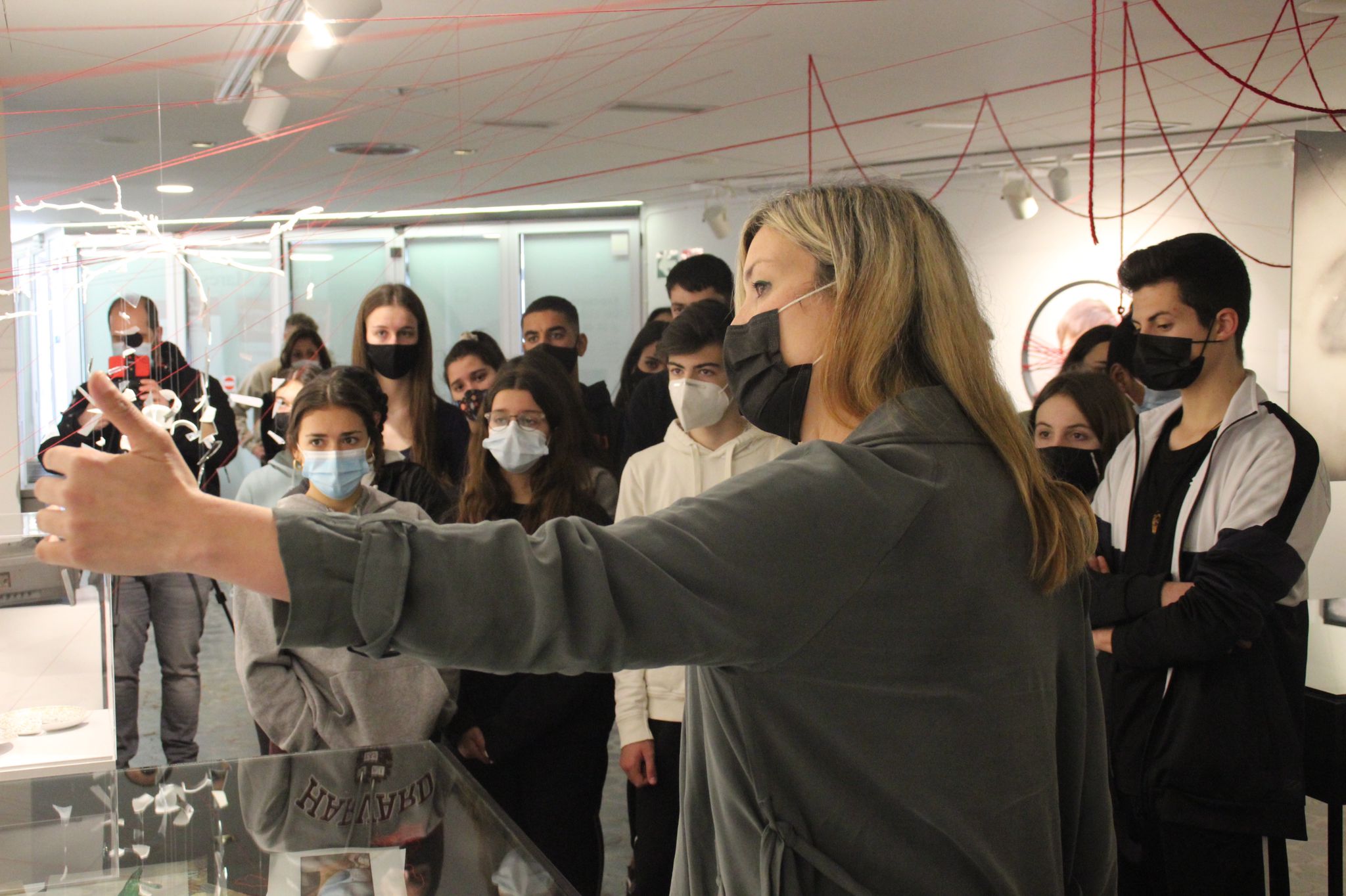 Amb l’objectiu de donar a conèixer als joves rosincs aquesta realitat i sensibilitzar-los sobre la necessitat d’actuar contra aquesta problemàtica i per la transformació de la societat, l’Ajuntament ha organitzat visites escolars, guiades per la pròpia artista, que tenen lloc durant aquesta setmana. Avui dimarts, han assistit a la mostra els alumnes de 4’ESO de l’institut Illa de Rodes, que també han estat acompanyats per la regidora de Joventut, Verònica Medina, i pel regidor d’Ensenyament de Roses, Marc Danés.