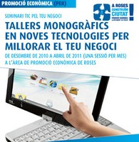 Per la seva banda, els seminaris TIC per a negocis consistiran en la realització d’un total de cinc tallers, centrats en l’ús de les noves tecnologies com a via de millora i rendiment d’un negoci. Concretament, les diferents sessions tractaran els següents aspectes: Eines per optimitzar el teu negoci, (16 de desembre), Eines telemàtiques (26 de gener), La gestió documental (16 de febrer), Com crear la teva pròpia pàgina web pel teu negoci (16 i 23 de març), La factura electrònica (6 d’abril)