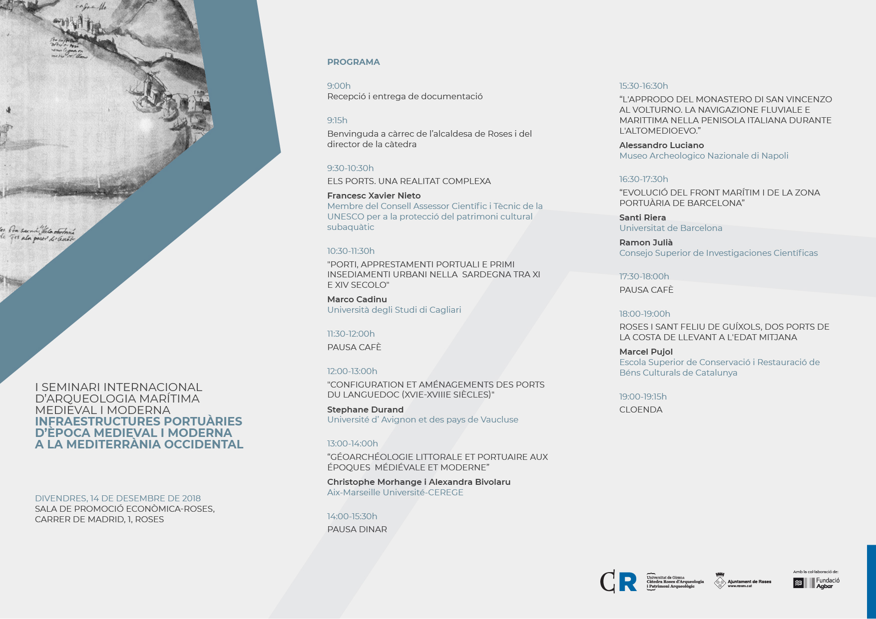 La conferència inicial serà realitzada per Francesc Xavier Nieto, (membre del consell Assessor Científic i Tècnic de la UNESCO per a la protecció del patrimoni cultural subaquàtic). Les ponències aniran a càrrec de destacats investigadors catalans, francesos i italians de les Universitats de Barcelona, Avignon, Aix-Marseille, Cagliari, així com del CSIC, el Museo Archeologico Nazionale di Napoli i l’Escola Superior de Conservació i Restauració de Béns Culturals de Catalunya, que presentaran casos d’estudi del Llenguadoc, Sardenya, sud d’Itàlia, Barcelona i la costa empordanesa.