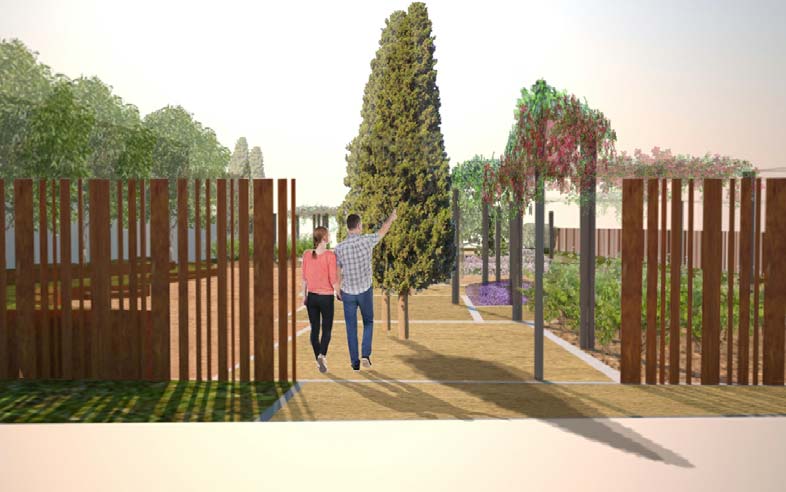 Un espai “plaça” adaptat a la topografia del terreny, crearà una petita graderia que permetrà la realització d’activitats culturals de petit format a l’aire lliure, mentre que un camí creuarà la finca creant diferents zones d’estada, repòs i mirador, potenciant les visuals cap al mar. S’instal·larà una pèrgola lleugera i d’aspecte natural, per on s’enfilaran els ceps, rosers i buguenvíl·lies, i que dotarà d’ombra el recorregut del nou camí. El projecte contempla també la reserva d’espai per a la construcció del futur equipament sociocultural previst.