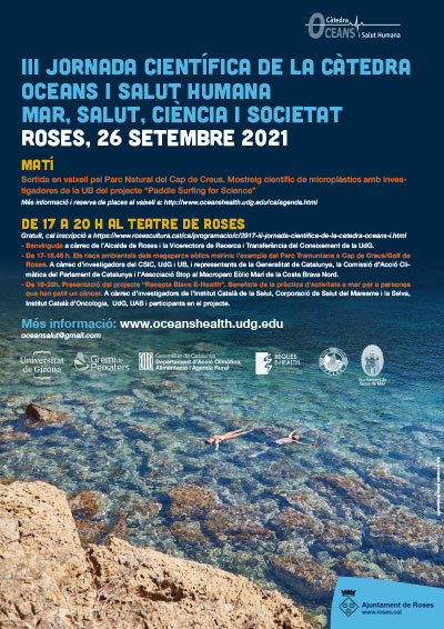 En el marc de la jornada, diumenge al matí tindrà lloc una sortida en vaixell pel Parc Natural del Cap de Creus i un mostreig científic de microplàstics amb investigadores de la UB del projecte “Paddle Surfing for Science”. Més informació i reserva de places al vaixell a: http://www.oceanshealth.udg.edu/ca/agenda.html