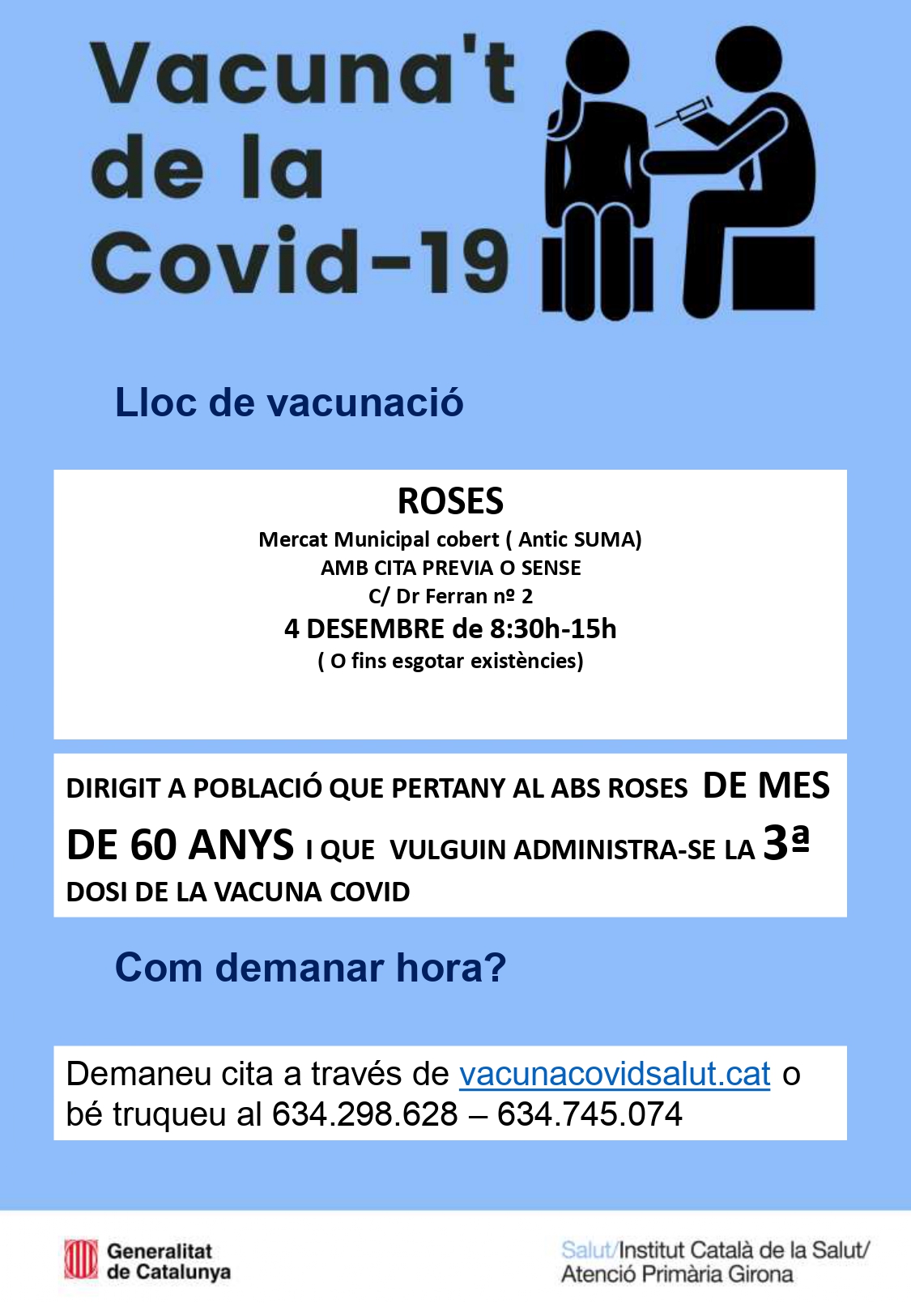 Per demanar cita podeu us podeu adreçar a vacunacovidsalut.cat o bé trucar al 634 298 628- 634 745 074.