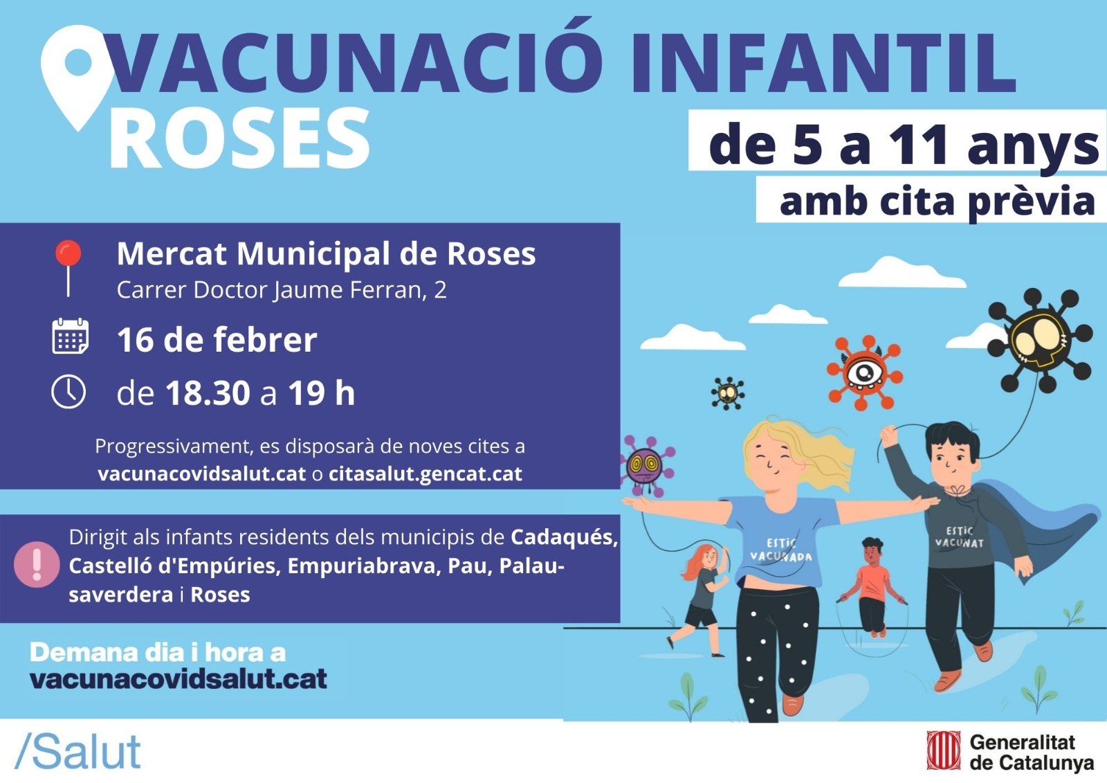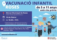 El proper dimecres, 16 de febrer, el centre de vacunació Covid-19 instal·lat al Mercat Municipal de Roses ofereix una jornada de vacunació infantil adreçada a infants de 5 a 11 anys.
