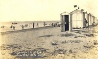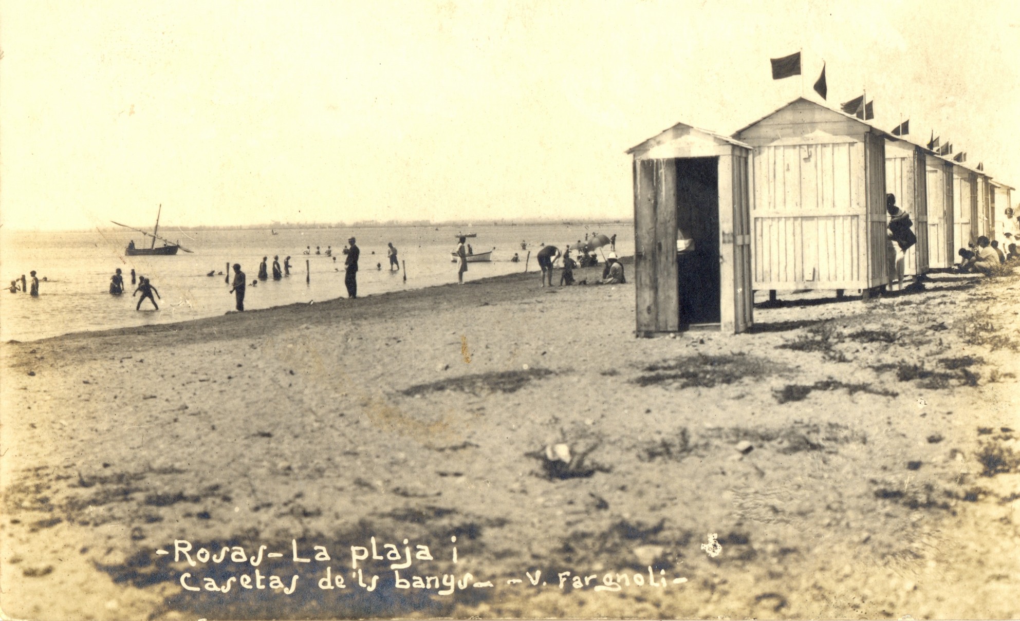 Valentí Fargnoli (1885 – 1944) va fixar, a finals de la dècada de 1920, la temporada de banys a Roses, a la zona de les Casetes de Bany, situada a la platja del Rastrell. La imatge mostra una sessió de sol i platja ben concorreguda, amb molta gent, en una escena emmarcada per les casetes de bany i el perfil llunyà de la primera línia de la població, enmig de la qual destaca, blanca, la casa de la família Pi i Sunyer.