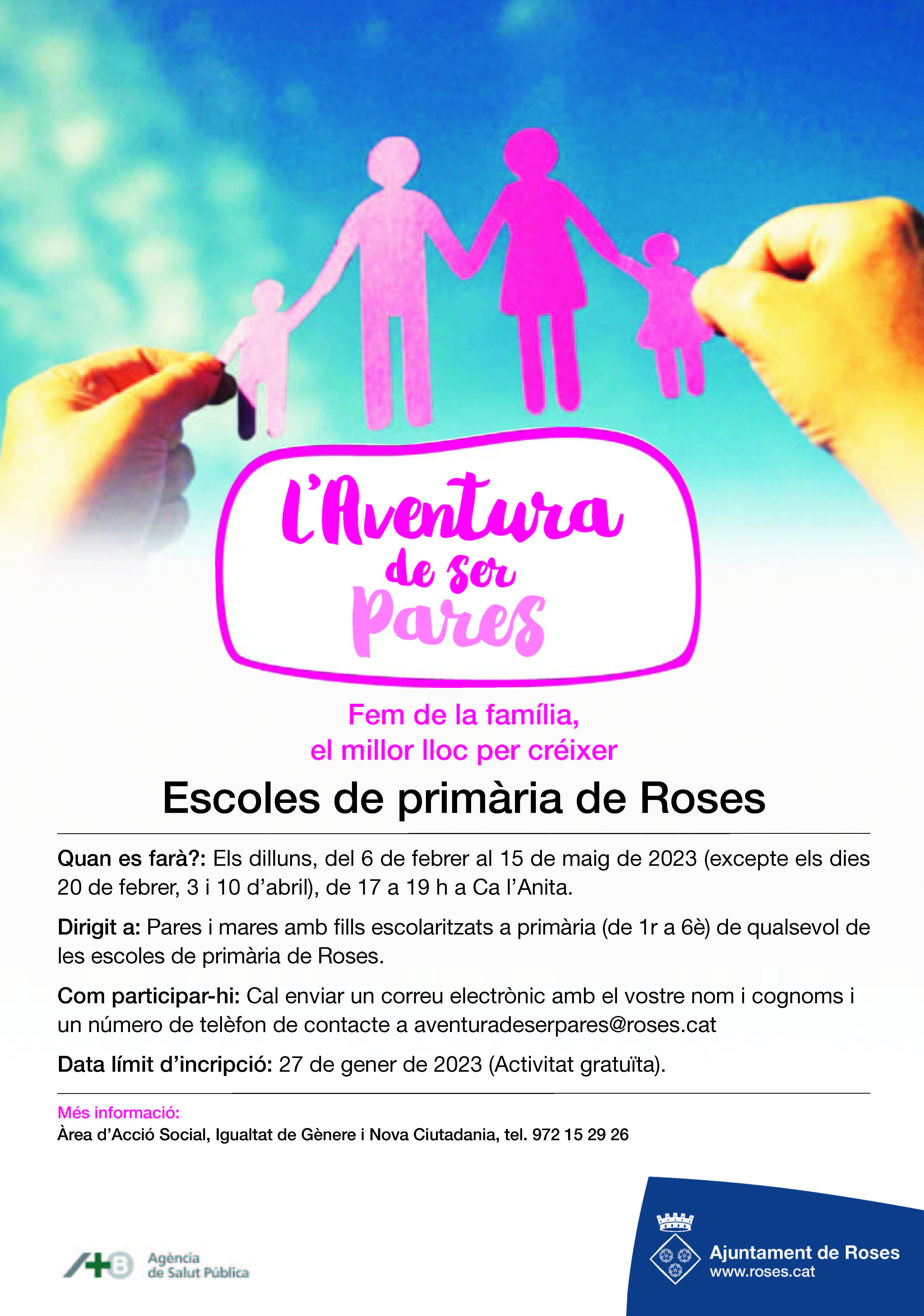 Les famílies interessades a participar en aquesta nova edició del programa han d’enviar un correu electrònic amb el nom i cognoms i un número de telèfon de contacte a: aventuradeserpares@roses.cat. La data límit d’inscripció és el 27 de gener.