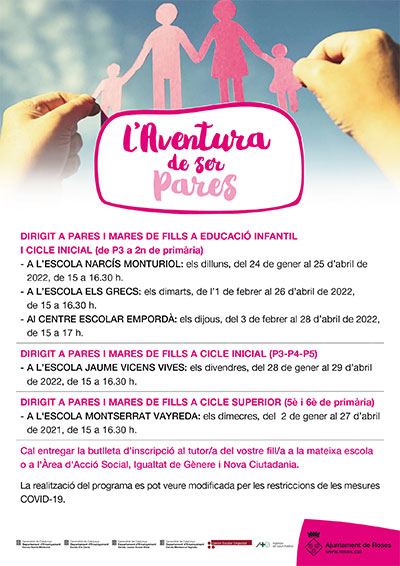L'Àrea d'Acció Social, Igualtat de Gènere i Nova Ciutadania de Roses organitza una nova edició de ‘L’Aventura de ser pares’, un programa adreçat a les famílies amb fills escolaritzats en els cicles d’educació infantil i primària, amb l’objectiu d’oferir un espai d’informació, formació i reflexió sobre aspectes relacionats amb la cura, l'educació i la socialització dels infants. Les activitats, que són gratuïtes, s’ofereixen a tots els centres de primària del municipi.