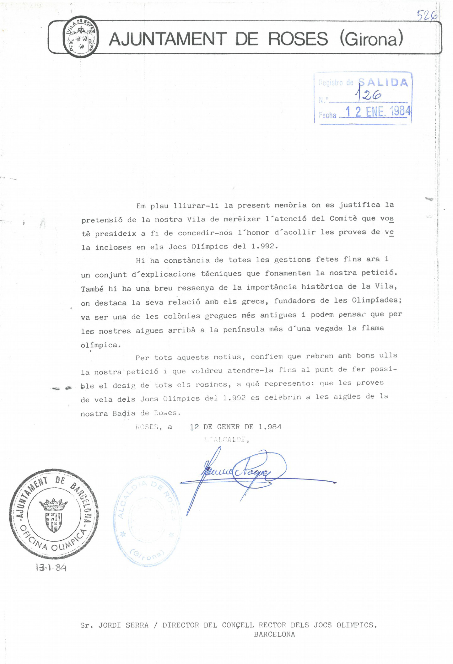 El 12 de gener de 1984, l'Ajuntament de Roses va enviar a l'Oficina Olímpica de l'Ajuntament de Barcelona una petició per acollir les proves de vela incloses als Jocs Olímpics de 1992. L'alcalde rosinc Jaume Noguer Vicens, del PSC i en el càrrec entre 1979 i 1987, sol·licitava al cap de l'oficina, Jordi Serra, la concessió d'aquest esdeveniment per fer possible "el desig de tots els rosincs". La carta anava acompanyada d'un dossier amb les característiques tècniques de la badia de Roses, de la població i de les infraestructures que s'havien de dur a terme per fer viable el projecte.