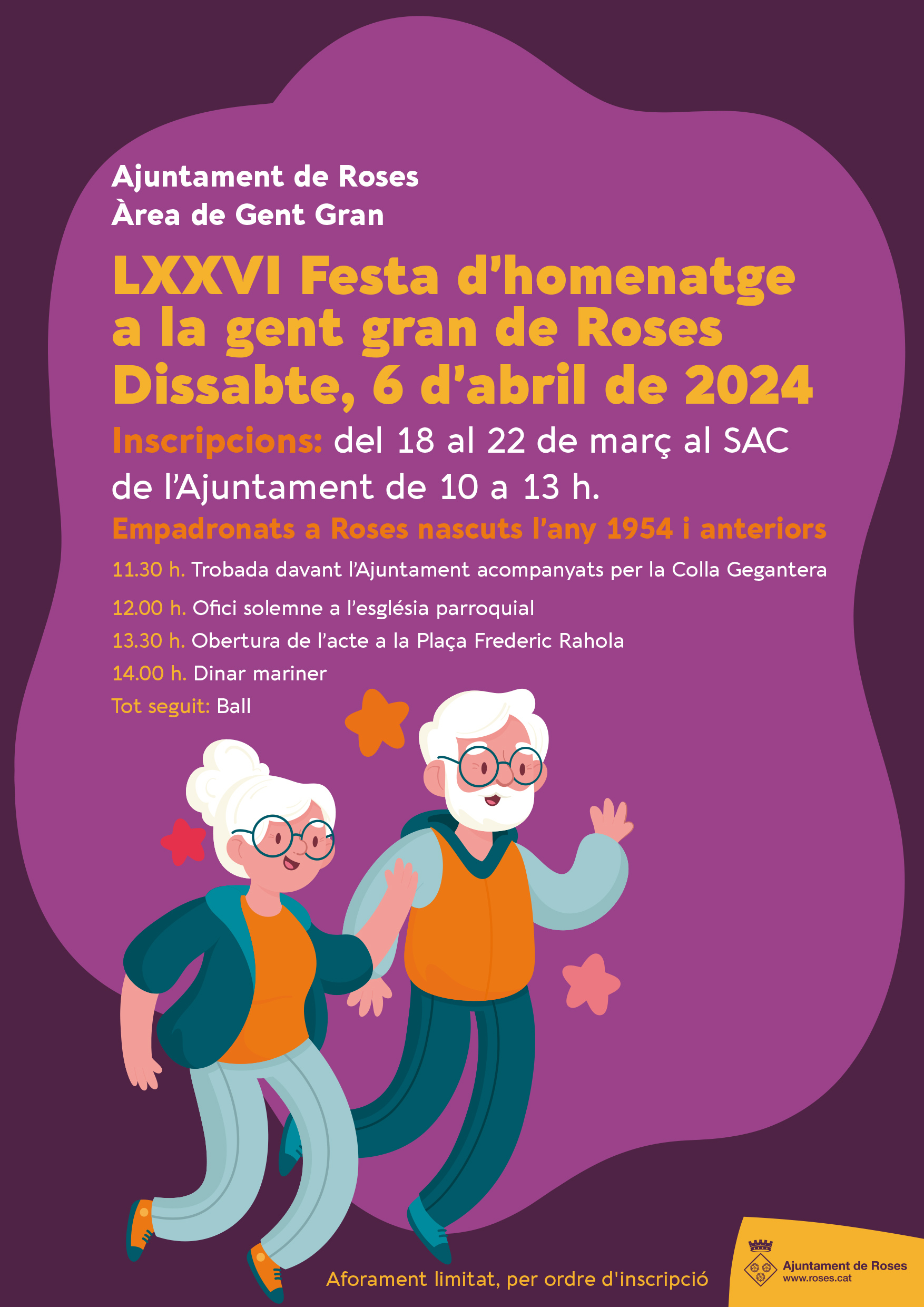 Poden participar totes les persones empadronades a Roses nascudes l’any 1954 i anteriors. El període d’inscripcions s’obrirà del 18 al 22 de març, al Servei d’Atenció a la Ciutadania- SAC de l’Ajuntament de Roses (pl. Catalunya, 12), en horari de 10 a 13 h.
