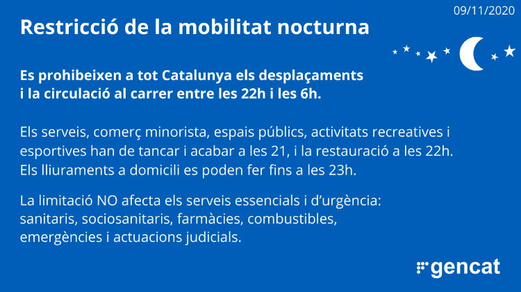 Consulteu a l'enllaç adjunt les restriccions vigents a Catalunya fins al proper 23 de novembre, d'acord a la pròrroga de mesures aprovada per la Generalitat de Catalunya.
