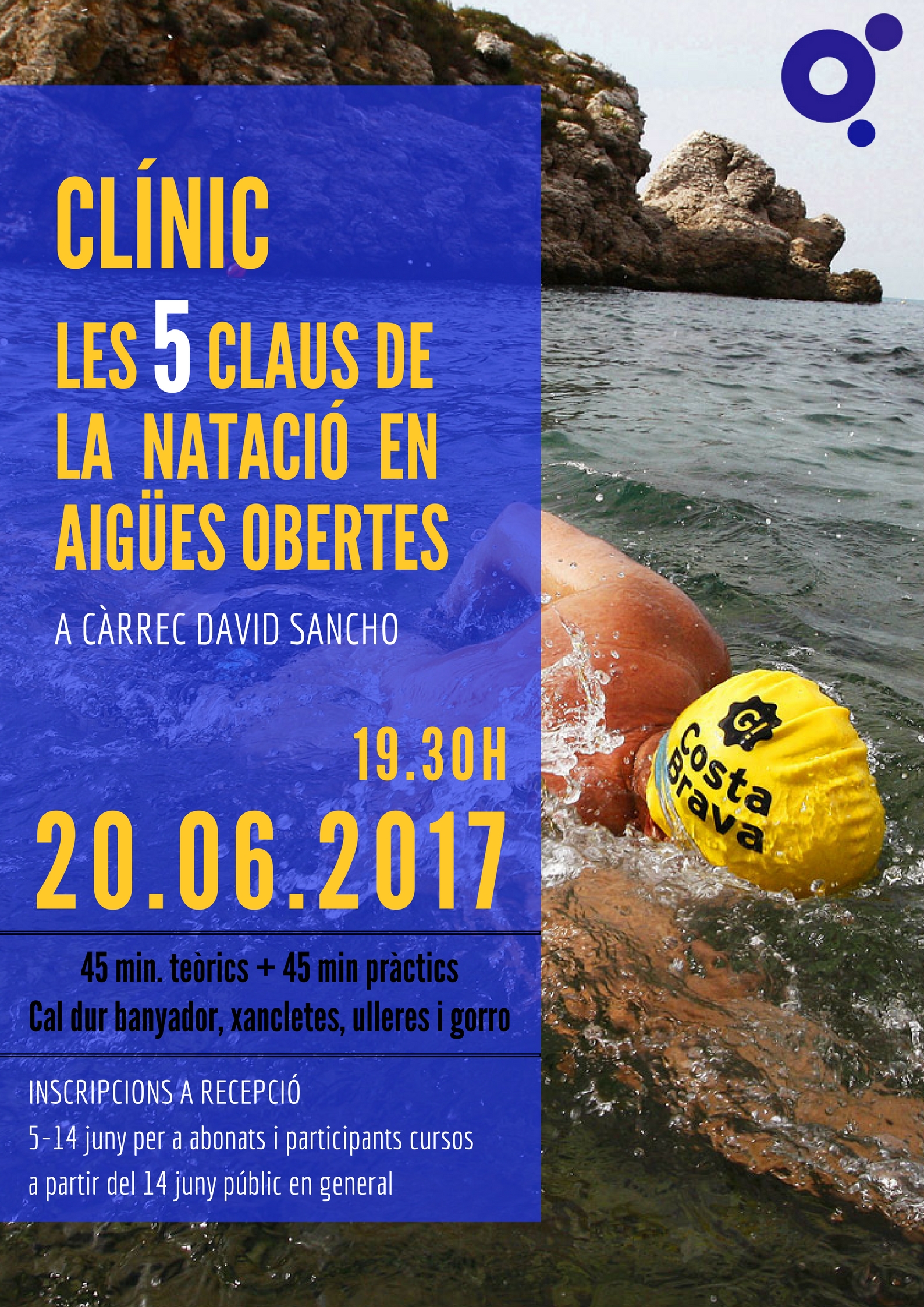 Dimarts 20 de juny, a les 19.30h, es durà a terme un clínic sobre la natació en aigües obertes, a càrrec del monitor esportiu de la Piscina Municipal, David Sancho, llicenciat en CAFE i especialista en natació i rendiment. S’abordaran les 5 claus que s’han de tenir en compte en la pràctica d’aquesta disciplina esportiva. L’activitat, que tindrà una durada aproximada d’hora i mitja, es dividirà en dues parts, una de teòrica i una altra de pràctica que es farà a la pròpia piscina.
