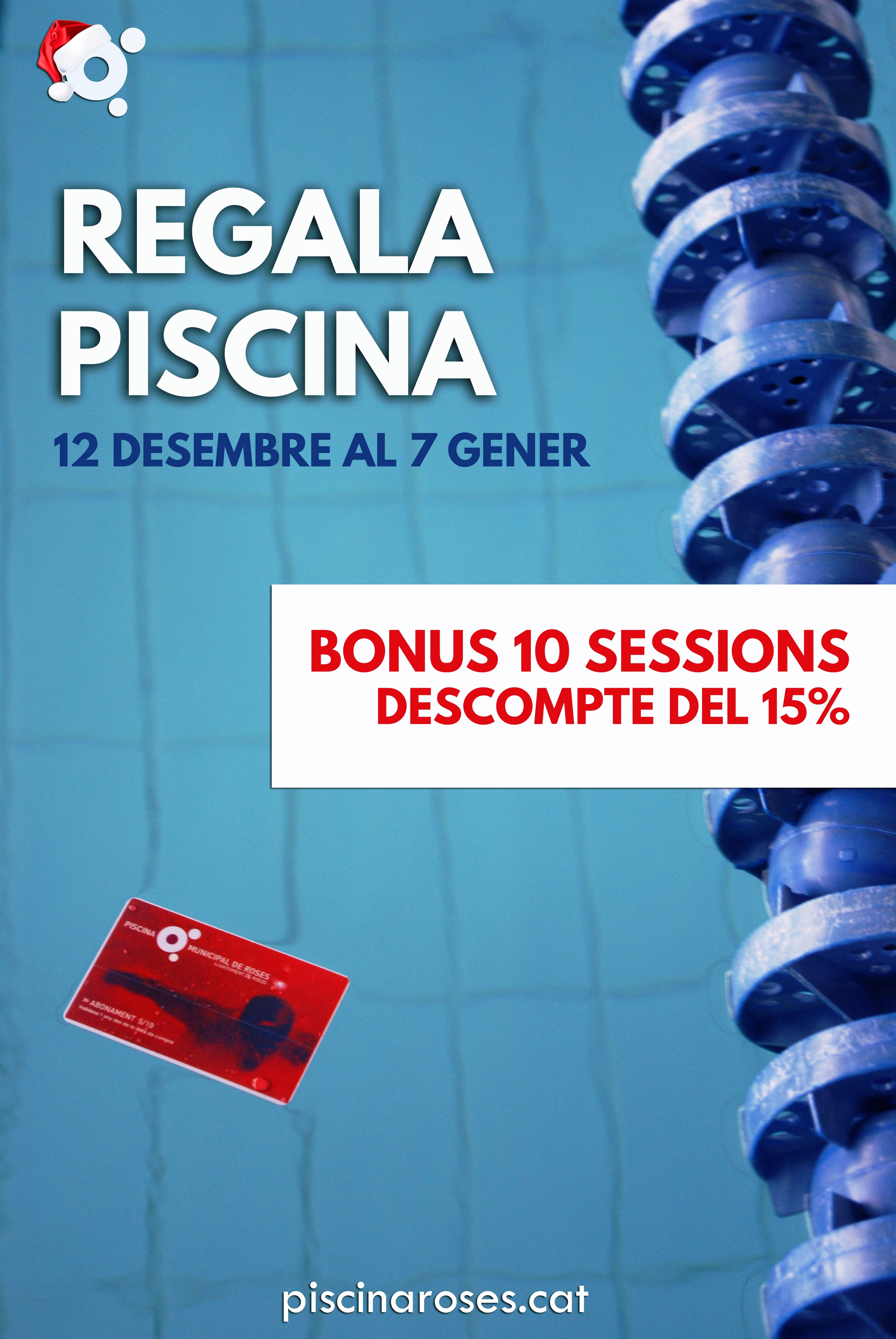 Per la seva banda, la campanya “Regala Piscina”, ofereix els bonus de 10 sessions amb descompte del 15% per a aquelles persones que vulguin regalar esport i salut. La promoció està vigent entre el 12 de desembre i el 7 de gener, a un preu d’adults de 58,60 € (sense promoció: 68,90 €) i de 43,60 € per a joves i gent gran (sense promoció: 51,30 €).