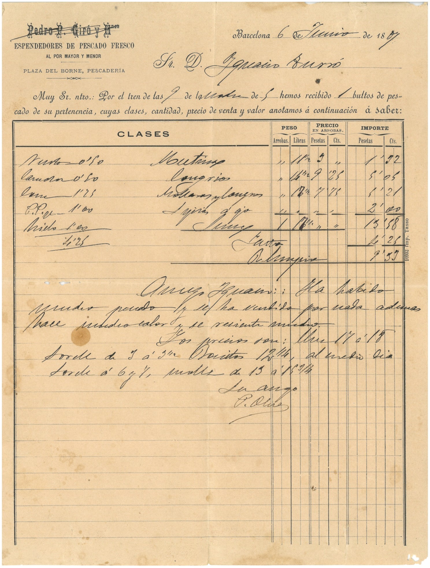 Ignasi Turró Sala, botiguer i comerciant rosinc, venia peix de Roses a Pere Pau Olivé, peixater al major i al detall amb parada oberta al mercat del Born de Barcelona. La mercaderia es feia arribar en tren i la documentació conservada deixa constància de diferents aspectes d’aquesta transacció comercial, com l'hora d'arribada del comboi, els paquets que transportava i el seu contingut. D'aquesta manera el peix arribava a port pels volts de les sis de la tarda i a la matinada següent ja era venut a la capital.