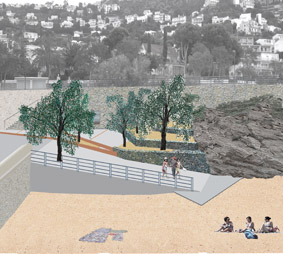 L'ordenació i embelliment de la resta de l'espai s'aconseguirà mantenint l'arbrat actual i incorporant unes plataformes esglaonades, a mena de feixes, que ascendiran fins a la roca. La primera comptarà amb una àrea de descans amb una font, mentre que la resta s'enjardinaran amb la plantació de nous arbres i arbusts propis de la zona. El mur de formigó es revestirà amb un aplacat de pedra per donar uniformitat al conjunt.