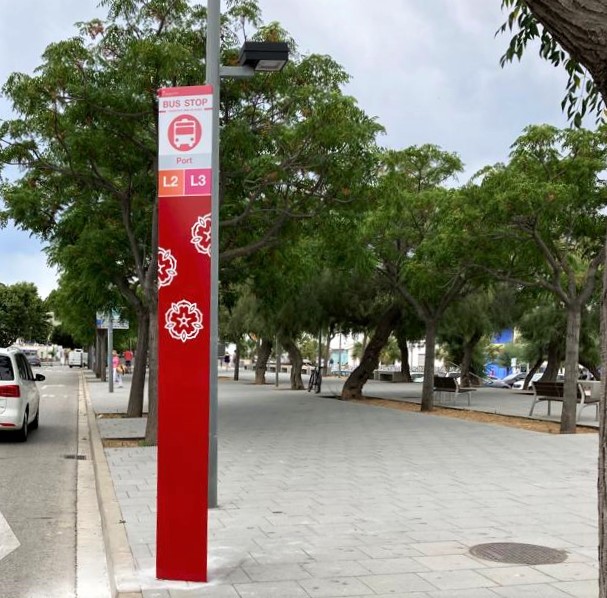 Fins ara els senyals existents consistien en una placa tipus banderola, que han estat substituïts pel nou sistema de columnes de tres laterals, decorades amb la imatge corporativa de Roses per a una ràpida identificació. Incorporen també vinils, amb la impressió del horaris de servei, el mapa de la ruta de cada línia i punts d’aturada i un codi QR on poder accedir a la informació de totes les línies de transport urbà.