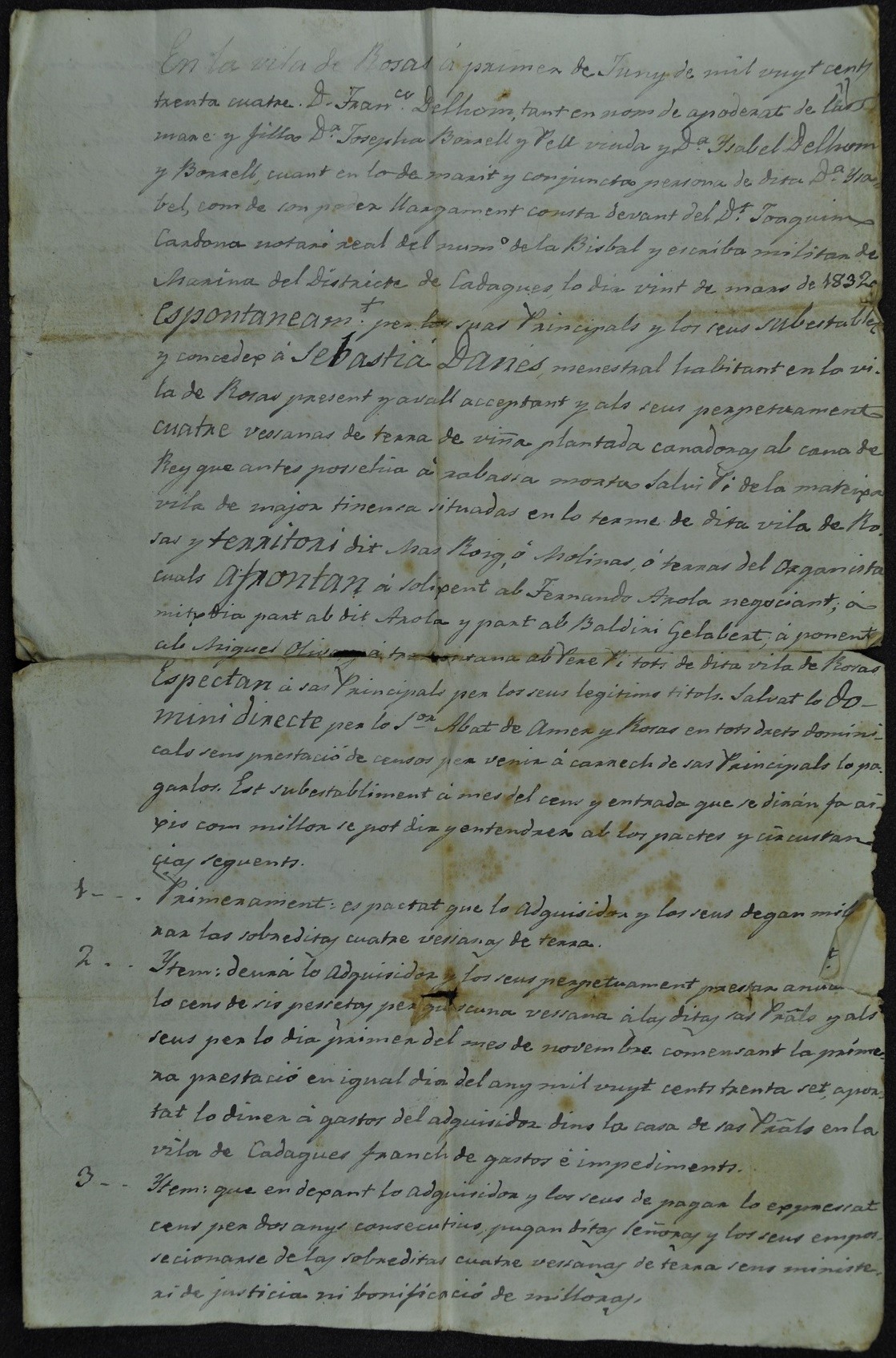 El document descriu el subestabliment de quatre vessanes de vinya situades al territori del mas Roig, Molinas o terres de l'Organista, al senyor Sebastià Danés, menestral de Roses, per part de Francisco Delhom, apoderat d'Isabel Borrell, la seva esposa. En base a aquest contracte, la família Danés va passar a treballar aquestes terres, a partir de l’1 de juny de 1834 i durant els anys successius.