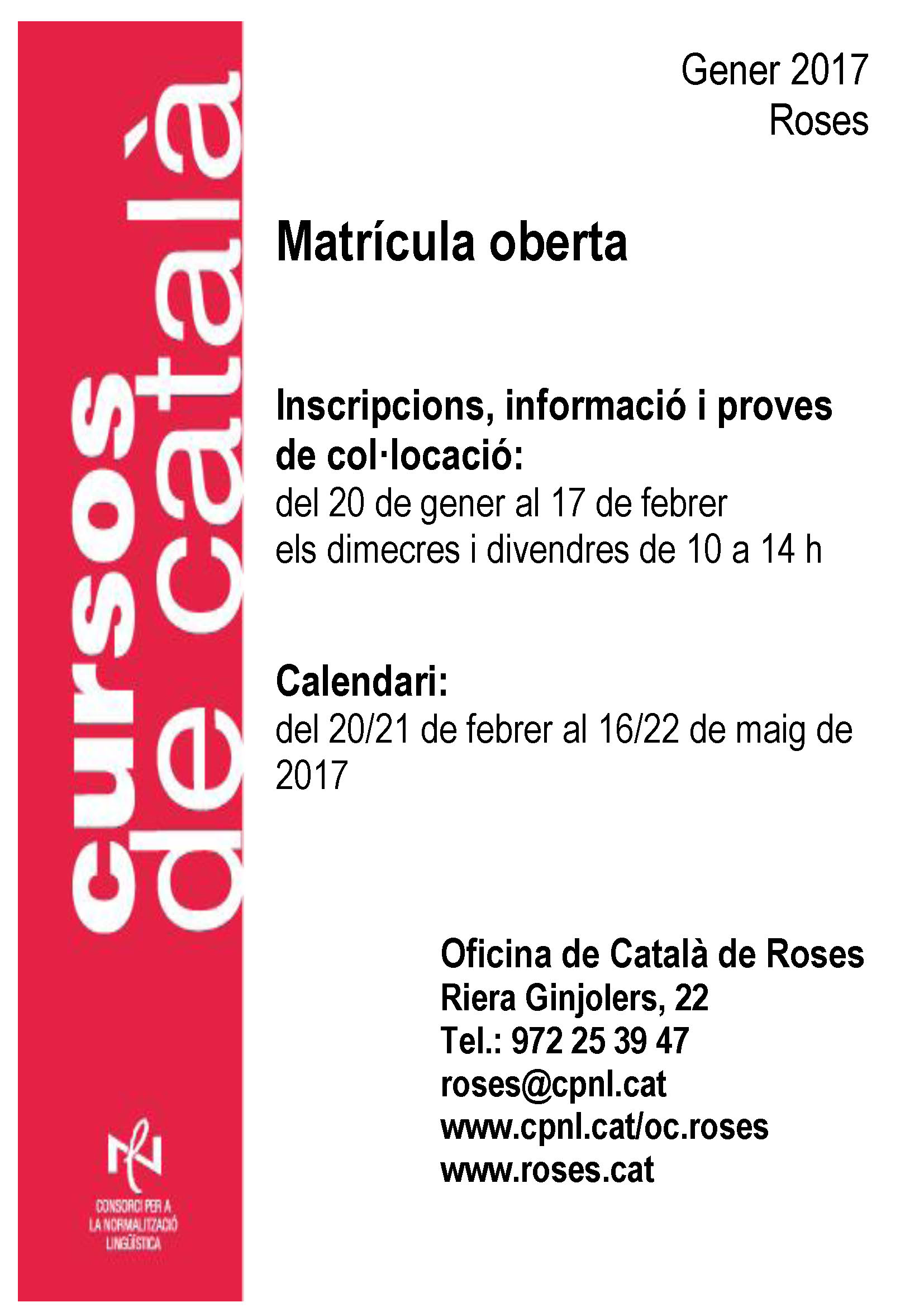 Entre el 20 de gener i el 17 de febrer, els dimecres i divendres de 10 a 14 h, l'Oficina de Català de Roses rebrà les inscripcions per participar en els cursos esmentats. La durada dels mateixos serà del 20 de febrer al 22 de maig en el cas dels cursos que s’imparteixen els dilluns i dimecres, mentre que els cursos que se celebraran dimarts i dijous tindran lloc entre el 21 de febrer i el 16 de maig.