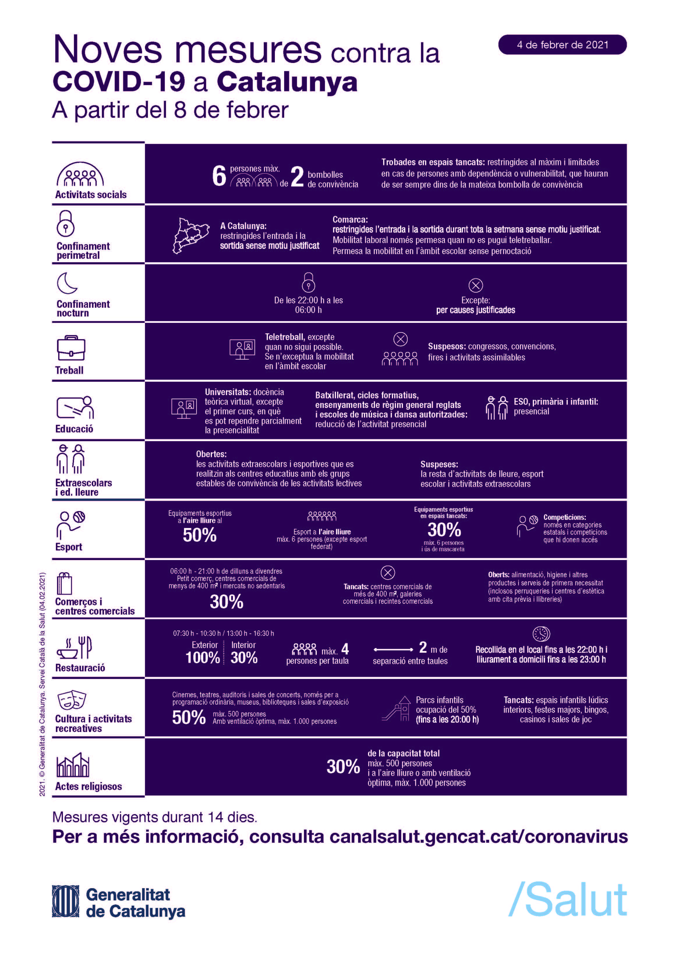 Davant de les actuals dades epidemiològiques a Catalunya, el 8 de febrer entren en vigor algunes modificacions de les mesures especials de contenció de la COVID-19. Els canvis modifiquen alguns dels aspectes que ja recollien les resolucions generals anteriors i estaran vigents durant 14 dies.