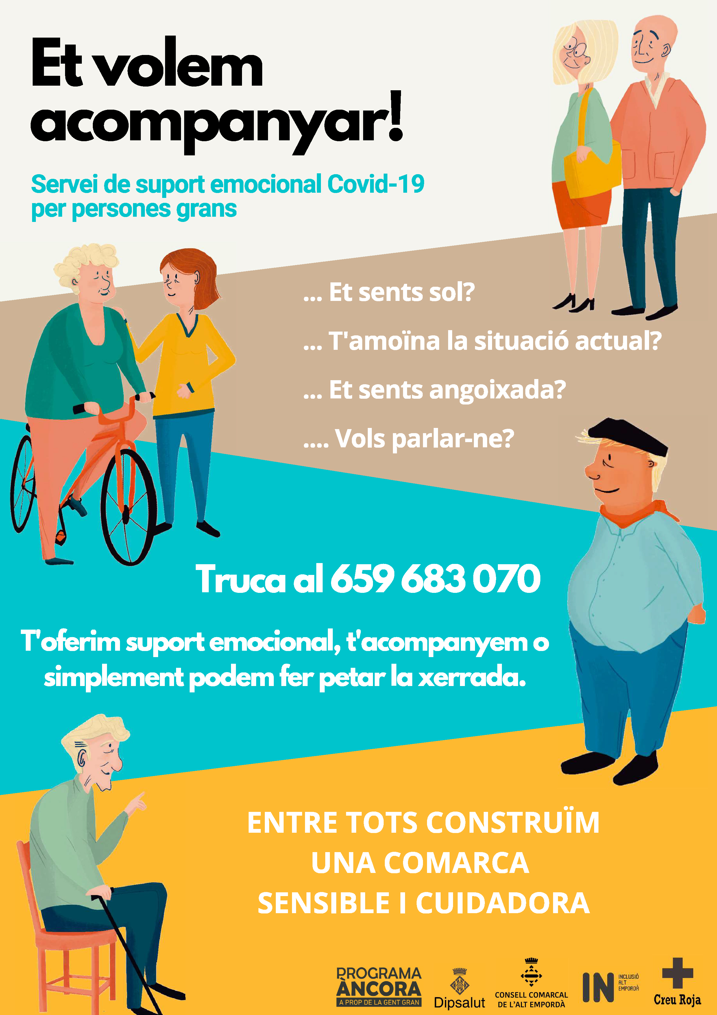 L’Àrea de Benestar Social del Consell Comarcal de l’Alt Empordà posa en funcionament el Servei de suport telefònic emocional COVID-19 per a persones grans de la comarca. Aquest servei s’adreça a persones grans dels municipis de l’Alt Empordà que puguin sentir-se soles, angoixades o simplement que tinguin la necessitat de parlar amb algú.