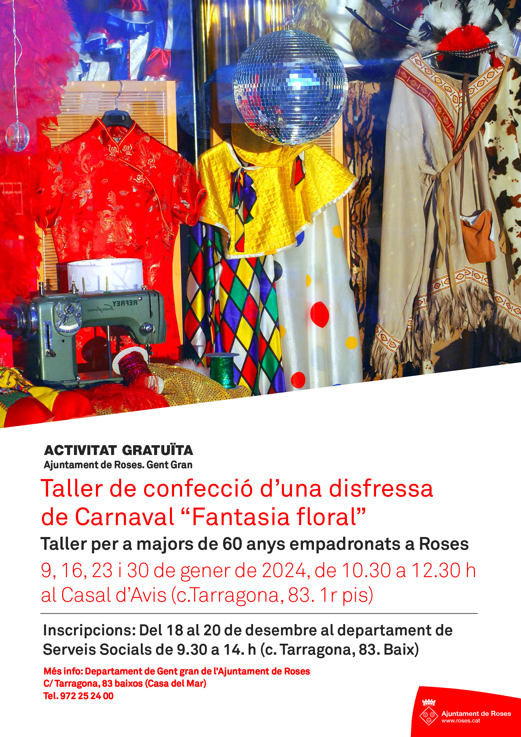 El taller té per objectiu l’elaboració d’una disfressa per al Carnaval de Roses, amb la temàtica ‘Una fantasia floral’. En el transcurs de les diferents sessions es posaran a disposició dels participants tots els materials necessaris i se’ls acompanyarà donant les indicacions per a la confecció dels diferents elements que formaran la disfressa.