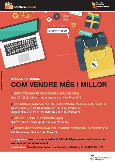 El primer mòdul formatiu tindrà lloc els dies 20 i 22 de febrer i 1 de març, i porta per títol «Estratègies per vendre més i millor". Es realitzarà en sessions de matí, de 9 a 14 hores i el seu preu és de 15 €. Un taller pràctic sobre xarxes socials aplicades al comerç serà la següent de les propostes. En aquests cas es realitzarà en dos grups els dies 3, 6, 8 i 10 de març i 2, 7, 9 i 14 de març respectivament, de 9 a 14 h. El preu del taller complet és de 20 €.