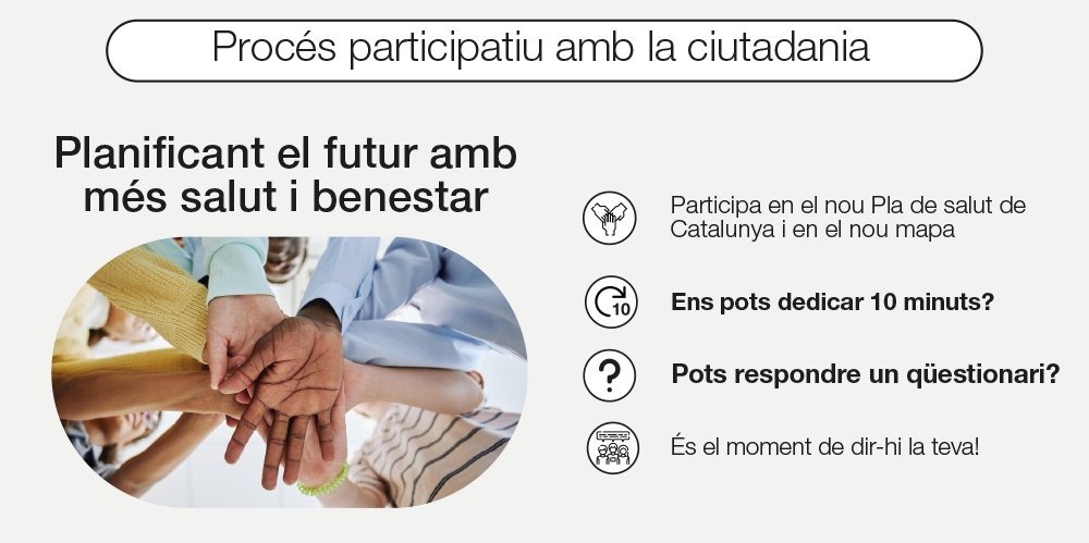 El departament de Salut de la Generalitat de Catalunya ha obert un procés de participació ciutadana per definir el Pla de Salut de Catalunya per als propers 5 anys i conèixer què pensa, què necessita i què proposa la ciutadania de Catalunya.