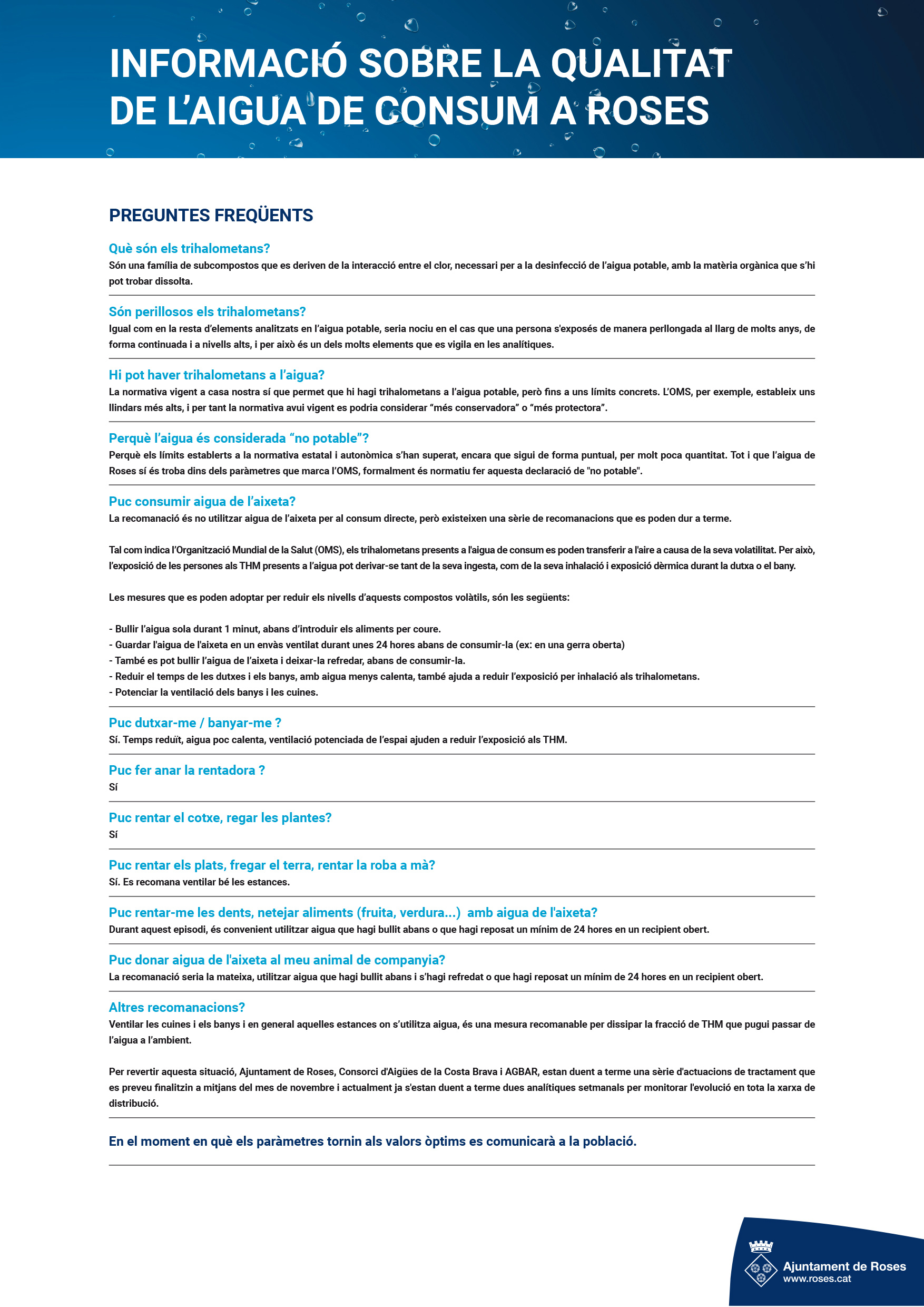 Per revertir aquesta situació, Ajuntament de Roses, Consorci d'Aigües de la Costa Brava i AGBAR, estan duent a terme una sèrie d'actuacions de tractament que es preveu finalitzin a mitjans del mes de novembre i actualment ja s'estan duent a terme dues analítiques setmanals per monitorar l'evolució en tota la xarxa de distribució. En el moment en què els paràmetres tornin als valors òptims es comunicarà a la població.