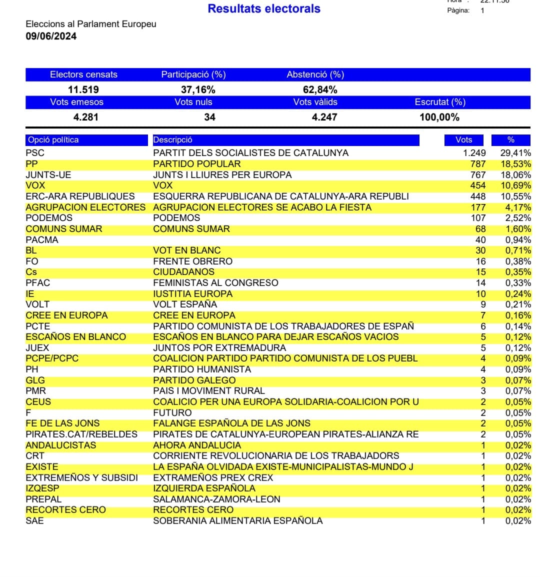 En el llistat adjunt podeu consultar els resultats a Roses de les Eleccions al Parlament Europeu celebrades ahir, diumenge 9 de juny de 2024.