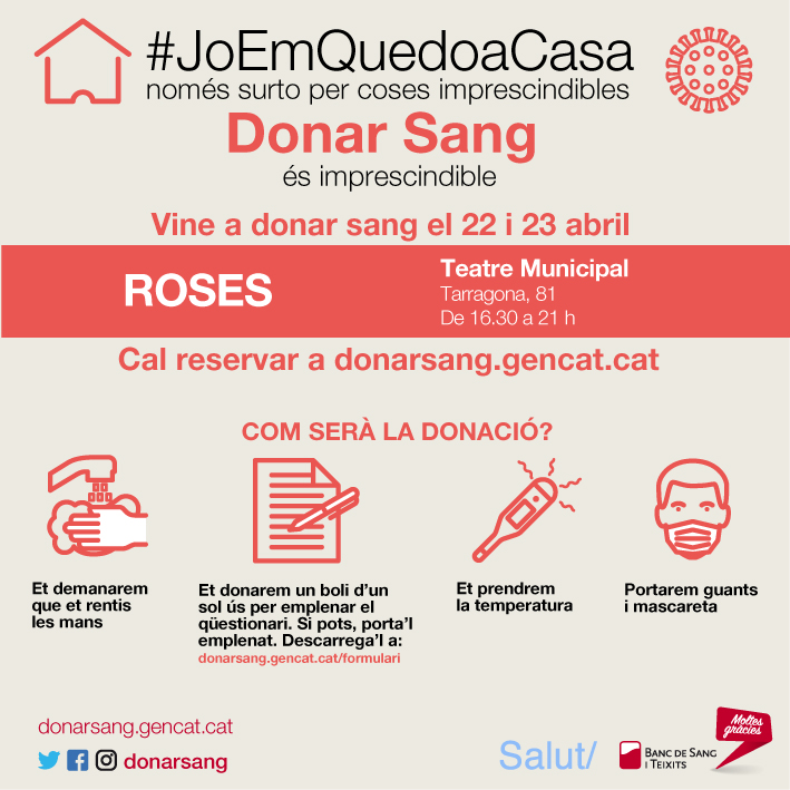 Roses s’ha sumat al conjunt de municipis catalans que han ofert els seus espais per garantir les donacions de sang a Catalunya durant aquests dies. El 22 i 23 d’abril, el Teatre Municipal comptarà amb un espai de donació, de 16.30 a 21 hores.