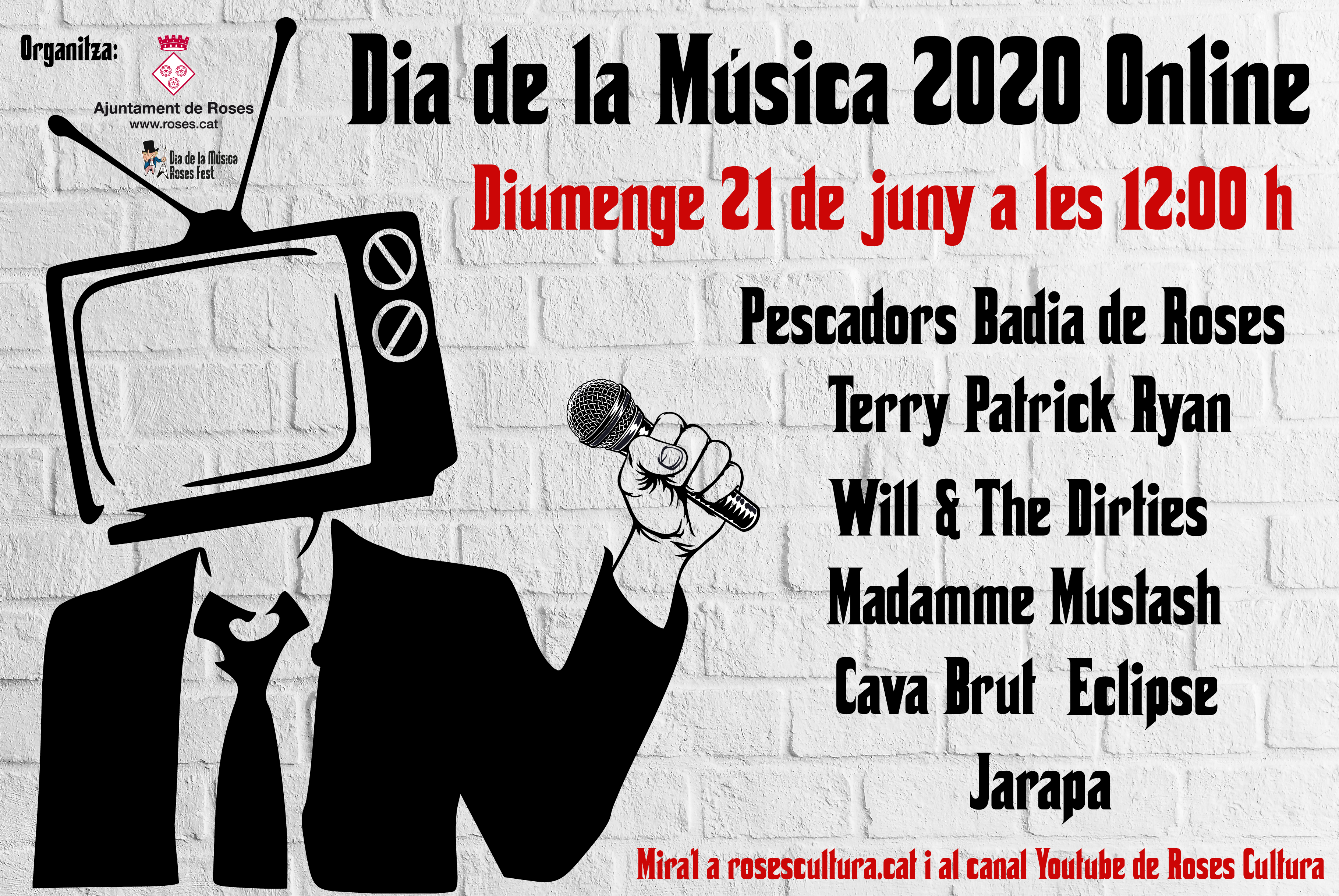 Roses reviurà així una jornada que en edicions anteriors oferia al llarg del dia diverses actuacions musicals en dos escenaris instal·lats a la Riera Ginjolers. La impossibilitat actual de realitzar les activitats de manera presencial, no impedirà la celebració. El Dia de la Música torna amb una proposta online per continuar sent altaveu del talent i la creació musical locals. Enguany comptarà amb les actuacions dels grups: Pescadors Badia de Roses, Terry Patrik Ryan, Will & The Dirties, Madamme Mustash, Cava Brut Eclipse i Jarapa.