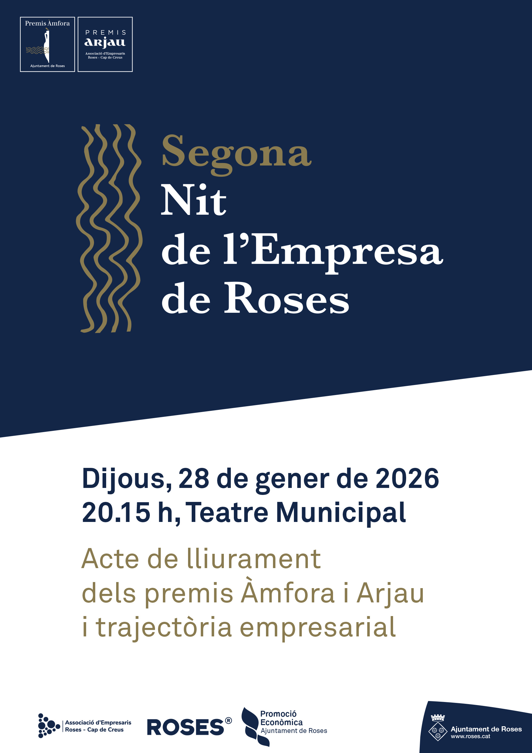 L’acte inclourà el lliurament del premi Àmfora, atorgat per l’Ajuntament de Roses, i del premi Arjau, impulsat per l’Associació d’Empresaris Roses-Cap de Creus. Ambdós guardons reconeixen anualment empreses i professionals que han destacat per la seva aportació al desenvolupament econòmic, social i territorial de Roses, així com per la seva trajectòria, excel·lència i compromís amb el municipi.